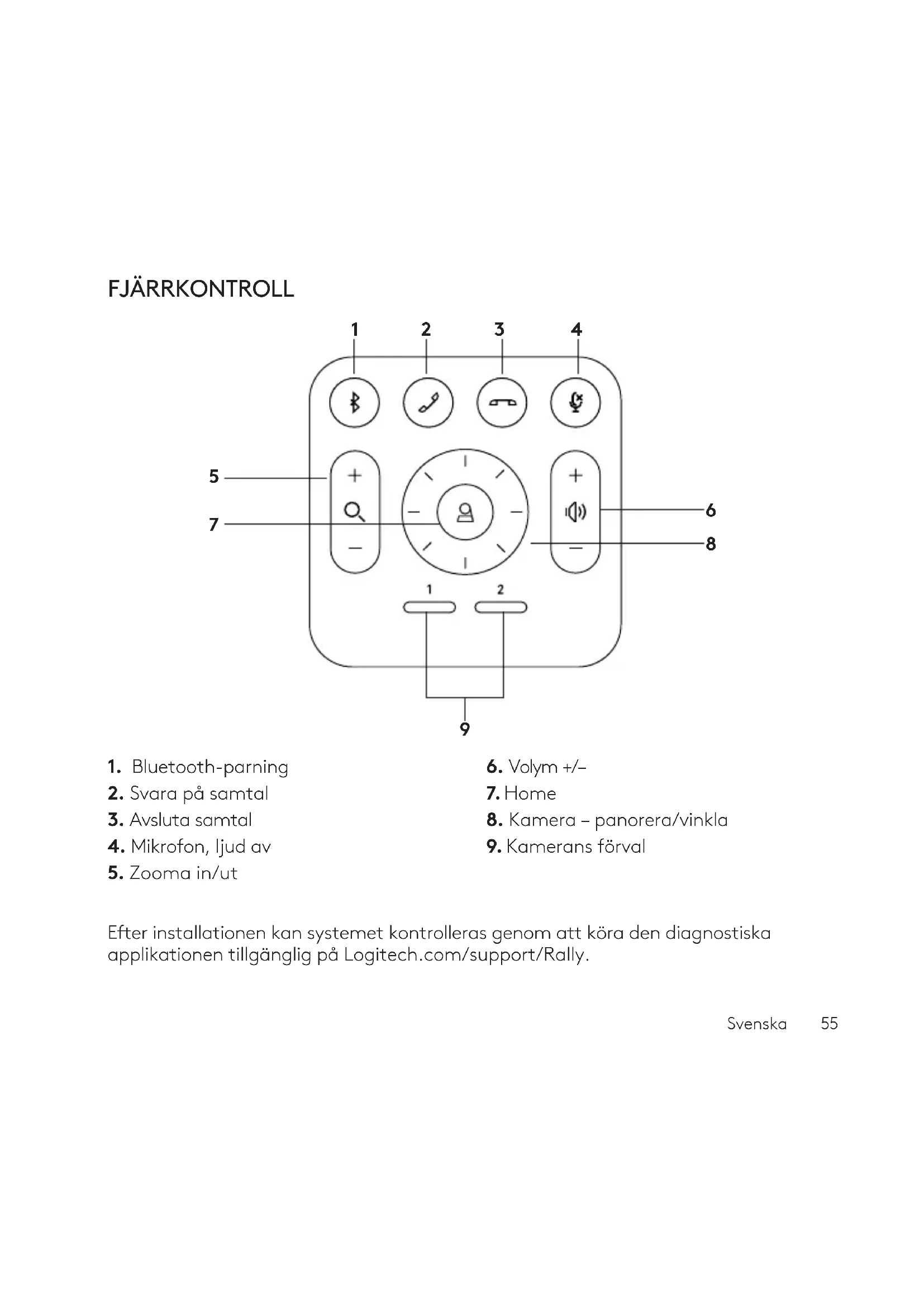Efter installationen kan systemet kontrolleras genom att köra den diagnostiska applikationen tillgänglig på Logitech.com/support/Rally. FJÄRRKONTROLL