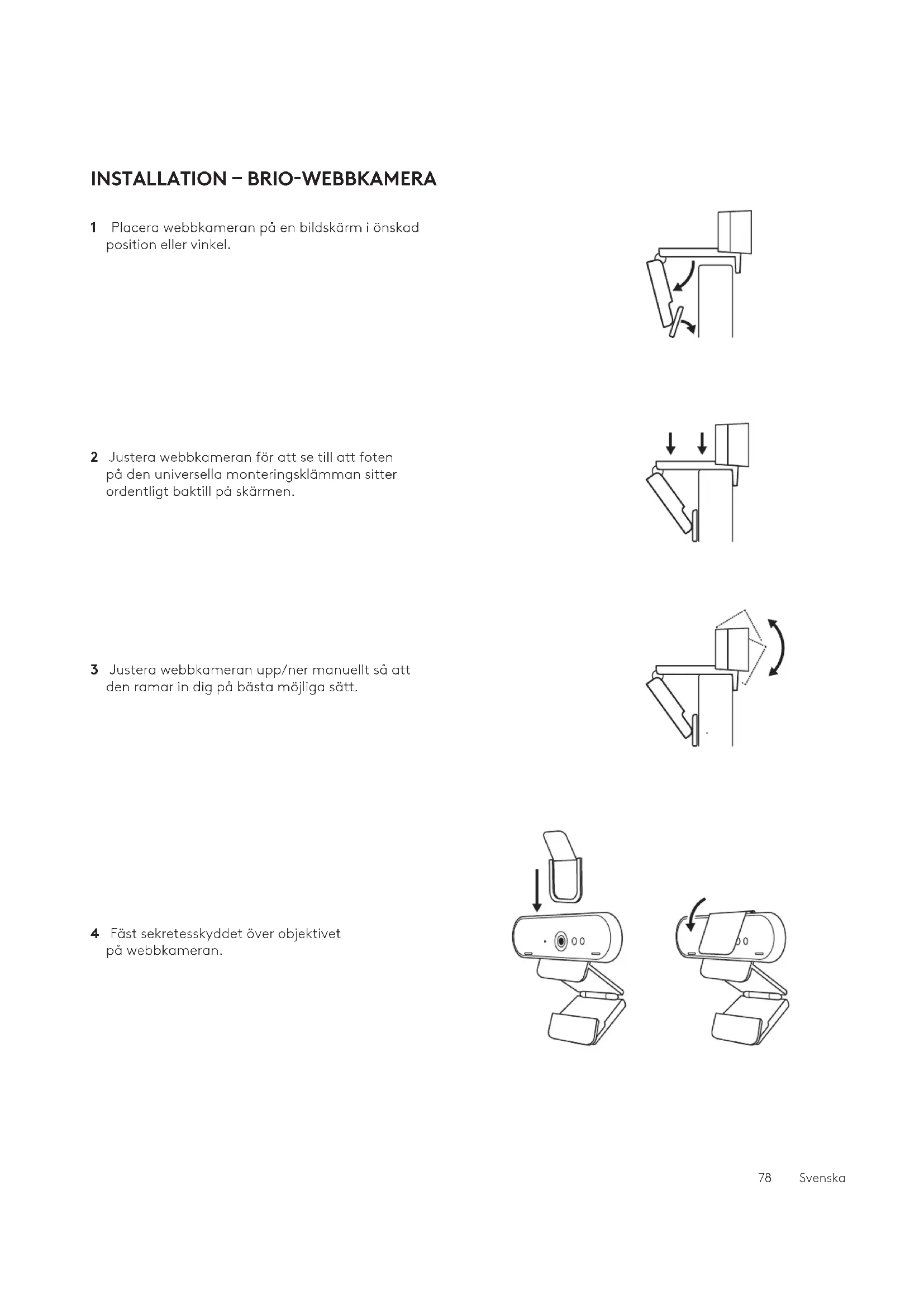 FUNKTIONER LOGI DOCK BRIO-WEBBKAMERA 1 Anslut med ett tryck 2 Strålformande mikrofon 3 Statusindikatorlampa 4 Omgivningsljus 5 Kensington-säkerhetsskåra 6 USB-C 1 Statusindikatorlampa 2 IR-sensor 3 IR-Indikatorlampa 76 SvenskaUSB-A USB-C Ethernet HDMI/skärmport ANSLUTNINGSÖVERSIKT 77 SvenskaINSTALLATION – BRIO-WEBBKAMERA 1 Placera webbkameran på en bildskärm i önskad position eller vinkel. 2 Justera webbkameran för att se till att foten på den universella monteringsklämman sitter ordentligt baktill på skärmen. 3 Justera webbkameran upp/ner manuellt så att den ramar in dig på bästa möjliga sätt. 4 Fäst sekretesskyddet över objektivet påwebbkameran. 78SvenskaINSTALLATION – ORGANISATIONSKIT FÖR USB-C-SLADDHANTERING 1 Rengör ytan. Dra av tejpen. 2 Tryck öglan mot bordet med kra i några sekunder. 79SvenskaINSTALLATION – ALTERNATIV FÖR MONTERINGSFÄSTE Alternativ 1 Montera Logi Dock på bordet med hjälp av de två medföljande skruvarna. Alternativ 2 Montera Logi Dock på bordet med VHB-tejp genom att applicera tejpen på undersidan av fästet. Alternativ 3 Säkra Logi Dock vid bordet med Kensington Lock.* *Lås ingår ej 80SvenskaINSTALLATION – SLADDHANTERING 1 Ta bort klämman med den medföljande insexnyckeln. Ly sedan av den övre och mittersta kammen. 2 Installera alla sladdar antingen i topp- eller bottenkammen baserat på kontaktens placering. 3 Ersätt klämman. Dra åt skruvarna för attsäkra sladdarna. 81SvenskaUC-VERSION 1 x 1 x2 sekunder 2 sekunder MICROSOFT TEAMS-VERSION REGLAGE Kalender- integration logitech.com/tune Anslut med ett tryck 82 Svenskax2