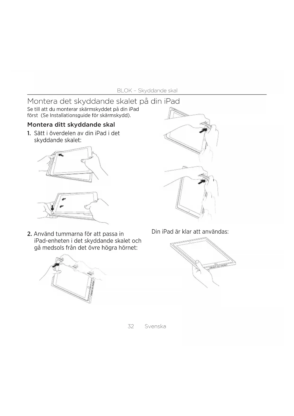 iPad-enheten i det skyddande skalet och gå medsols från det övre högra hörnet: Din iPad är klar att användas:Svenska 33 BLOK – Skyddande skal Lossa din iPad från det skyddande skalet