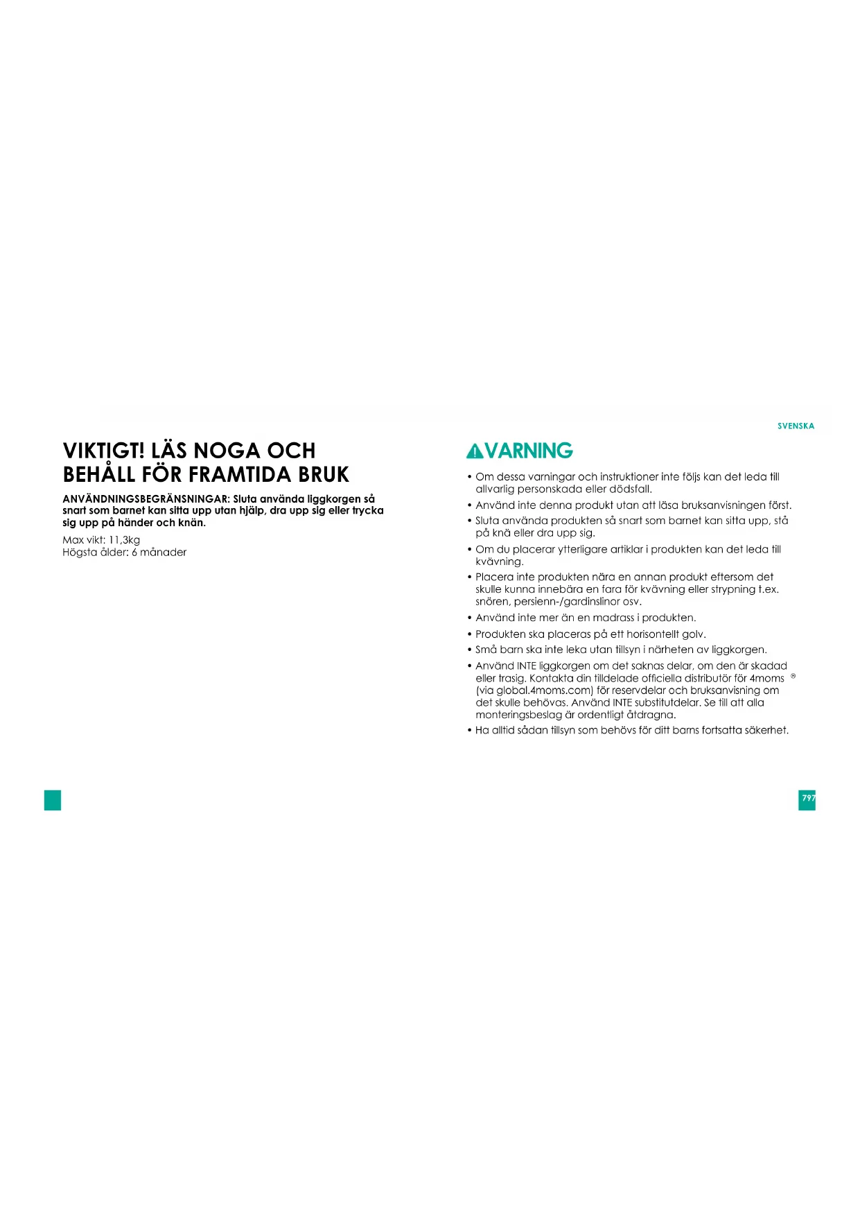 ANVÄNDNINGSBEGRÄNSNINGAR: Sluta använda liggkorgen så snart som barnet kan sitta upp utan hjälp, dra upp sig eller trycka sig upp på händer och knän. Maxvikt:11,3kg Högsta ålder: 6 månader VARNING