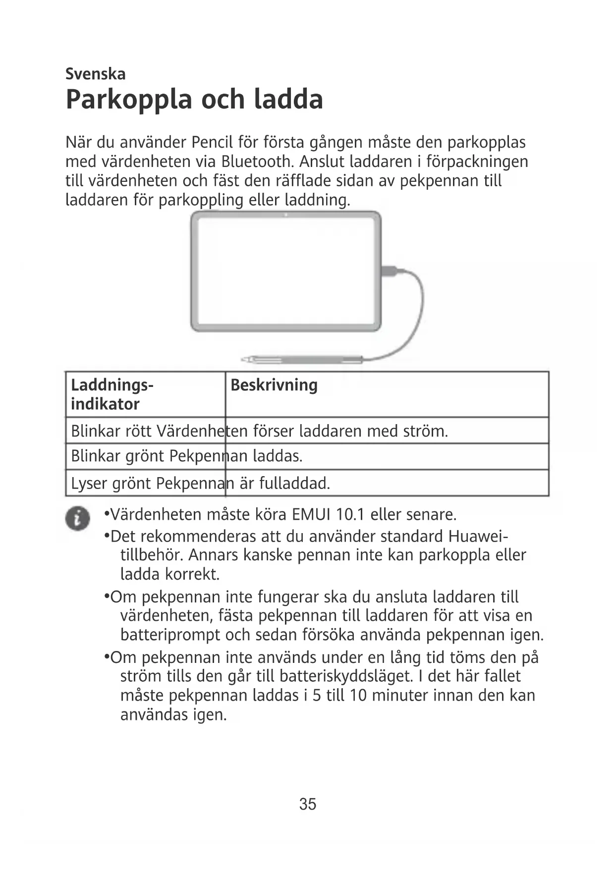 - Det rekommenderas att du använder standard Huawei- tillbehör. Annars kanske pennan inte kan parkoppla eller ladda korrekt.