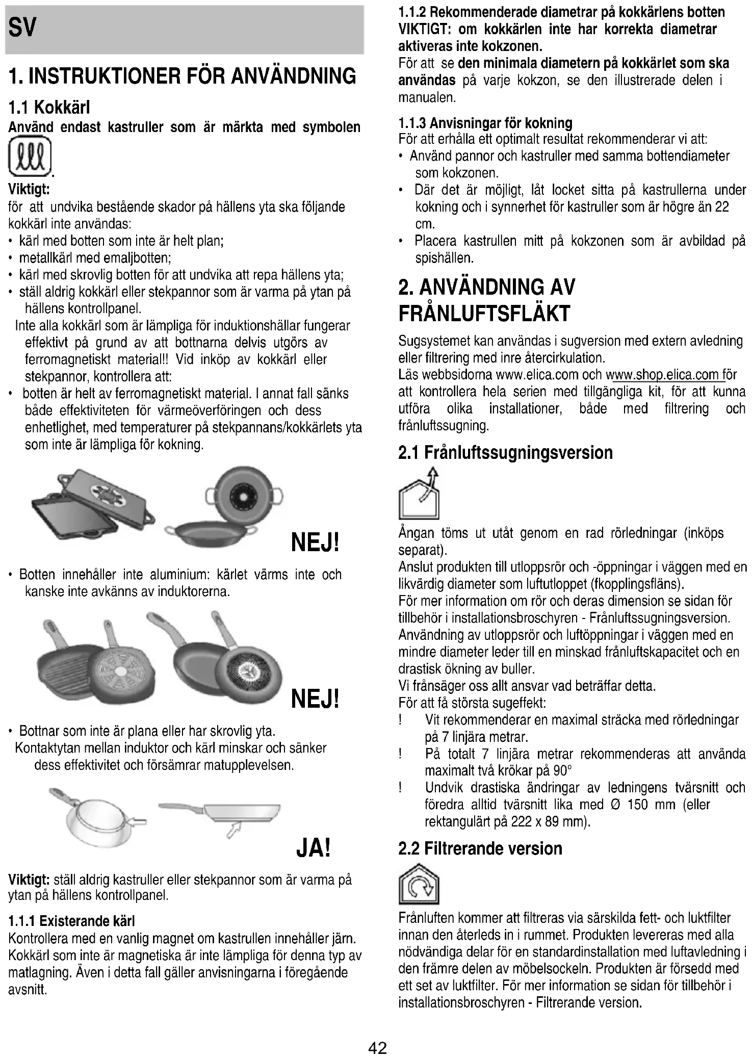 Sugsystemet kan användas i sugversion med extern avledning eller filtrering med inre återcirkulation. Läs webbsidorna www.elica.com och www.shop.elica.com för att kontrollera hela serien med tillgängliga kit, för att kunna utföra olika installationer, både med filtrering och frånluftssugning.
