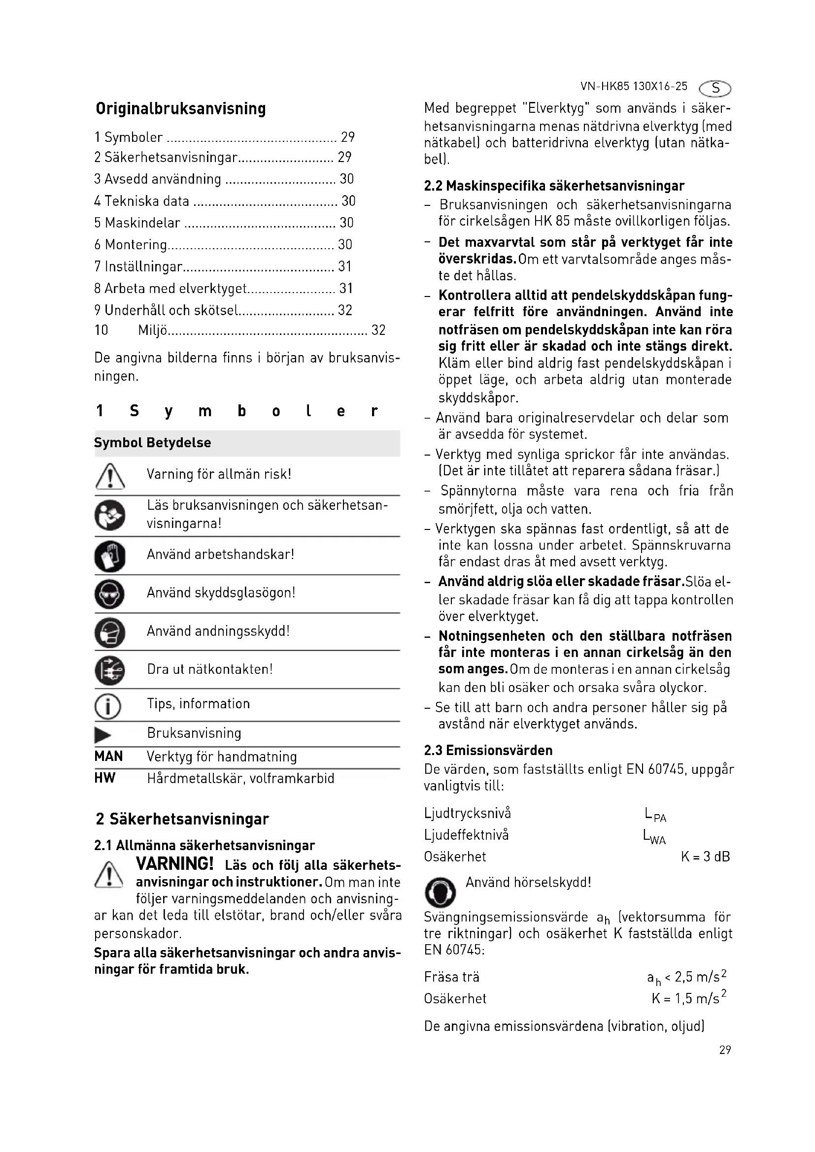 - Bruksanvisingen och sakerhetsanvisningarna for cirkelsågen HK 85 maste ovillkorligen foljas.