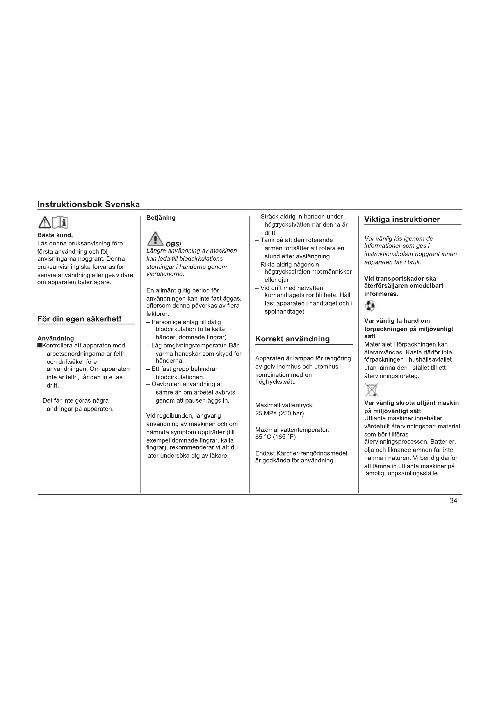 Bäste kund, Läs denna bruksanvisning före första användning och följ anvisningarna noggrant. Denna bruksanvisning ska förvaras för senare användning eller ges vidare om apparaten byter ägare. För din egen säkerhet! Användning ■ Kontrollera att apparaten med arbetsanordningarna är felfri och driftsäker före användningen. Om apparaten inte är felfri, får den inte tas i drift. – Det får inte göras några ändringar på apparaten. Betjäning OBS! Längre användning av maskinen kan leda till blodcirkulations- störningar i händerna genom vibrationerna. En allmänt giltig period för användningen kan inte fastläggas, eftersom denna påverkas av flera faktorer: – Personliga anlag till dålig blodcirkulation (ofta kalla händer, domnade fingrar). – Låg omgivningstemperatur. Bär varma handskar som skydd för händerna. – Ett fast grepp behindrar blodcirkulationen. – Oavbruten användning är sämre än om arbetet avbryts genom att pauser läggs in. Vid regelbunden, långvarig användning av maskinen och om nämnda symptom uppträder (till exempel domnade fingrar, kalla fingrar), rekommenderar vi att du låter undersöka dig av läkare. – Sträck aldrig in handen under högtryckstvätten när denna är i drift – Tänk på att den roterande armen fortsätter att rotera en stund efter avstängning – Rikta aldrig någonsin högtrycksstrålen mot människor eller djur – Vid drift med hetvatten körhandtagets rör bli heta. Håll fast apparaten i handtaget och i spolhandtaget Korrekt användning Apparaten är lämpad för rengöring av golv inomhus och utomhus i kombination med en högtryckstvätt. Maximalt vattentryck: 25 MPa (250 bar) Maximal vattentemperatur: 85 °C (185 °F) Endast Kärcher-rengöringsmedel är godkända för användning. Viktiga instruktioner Var vänlig läs igenom de informationer som ges i instruktionsboken noggrant innan apparaten tas i bruk. Vid transportskador ska återförsäljaren omedelbart informeras. Var vänlig ta hand om förpackningen på miljövänligt sätt Materialet i förpackningen kan återanvändas. Kasta därför inte förpackningen i hushållsavfallet utan lämna den i stället till ett återvinningsföretag. Var vänlig skrota uttjänt maskin på miljövänligt sätt Uttjänta maskiner innehåller värdefullt återvinningsbart material som bör tillföras återvinningsprocessen. Batterier, olja och liknande ämnen får inte hamna i naturen. Vi ber dig därför att lämna in uttjänta maskiner på lämpligt uppsamlingsställe.Instruktionsbok Svenska