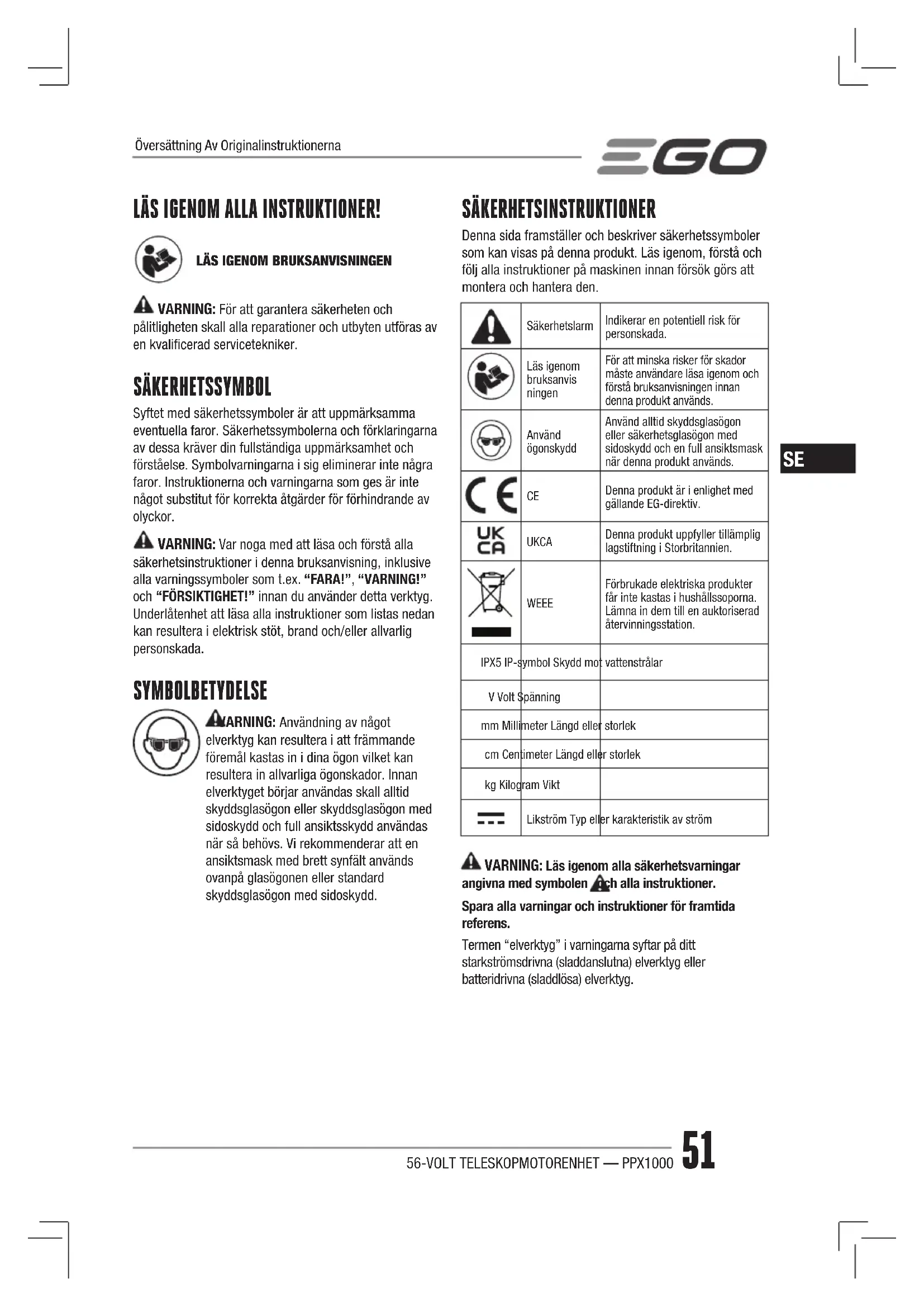 VARNING: För att garantera säkerheten och pålitligheten skall alla reparationer och utbyten utföras av en kvalicerad servicetekniker. SÄKERHETSSYMBOL Syftet med säkerhetssymboler är att uppmärksamma eventuella faror. Säkerhetssymbolerna och förklaringarna av dessa kräver din fullständiga uppmärksamhet och förståelse. Symbolvarningarna i sig eliminerar inte några faror. Instruktionerna och varningarna som ges är inte något substitut för korrekta åtgärder för förhindrande av olyckor. VARNING: Var noga med att läsa och förstå alla säkerhetsinstruktioner i denna bruksanvisning, inklusive alla varningssymboler som t.ex. “FARA!”, “VARNING!” och “FÖRSIKTIGHET!” innan du använder detta verktyg. Underlåtenhet att läsa alla instruktioner som listas nedan kan resultera i elektrisk stöt, brand och/eller allvarlig personskada. SYMBOLBETYDELSE VARNING: Användning av något elverktyg kan resultera i att främmande föremål kastas in i dina ögon vilket kan resultera in allvarliga ögonskador. Innan elverktyget börjar användas skall alltid skyddsglasögon eller skyddsglasögon med sidoskydd och full ansiktsskydd användas när så behövs. Vi rekommenderar att en ansiktsmask med brett synfält används ovanpå glasögonen eller standard skyddsglasögon med sidoskydd. SÄKERHETSINSTRUKTIONER Denna sida framställer och beskriver säkerhetssymboler som kan visas på denna produkt. Läs igenom, förstå och följ alla instruktioner på maskinen innan försök görs att montera och hantera den. SäkerhetslarmIndikerar en potentiell risk för personskada.Läs igenom bruksanvis ningenFör att minska risker för skador måste användare läsa igenom och förstå bruksanvisningen innan denna produkt används.Använd ögonskyddAnvänd alltid skyddsglasögon eller säkerhetsglasögon med sidoskydd och en full ansiktsmask när denna produkt används. Denna produkt är i enlighet med gällande EG-direktiv. UKCA Denna produkt uppfyller tillämplig lagstiftning i Storbritannien. WEEE Förbrukade elektriska produkter får inte kastas i hushållssoporna. Lämna in dem till en auktoriserad återvinningsstation.IPX5 IP-symbol Skydd mot vattenstrålarV Volt Spänningmm Millimeter Längd eller storlekcm Centimeter Längd eller storlekkg Kilogram ViktLikström Typ eller karakteristik av ström VARNING: Läs igenom alla säkerhetsvarningar angivna med symbolen och alla instruktioner. Spara alla varningar och instruktioner för framtida referens. Termen “elverktyg” i varningarna syftar på ditt starkströmsdrivna (sladdanslutna) elverktyg eller batteridrivna (sladdlösa) elverktyg. Översättning Av Originalinstruktionerna56-VOLT TELESKOPMOTORENHET — PPX1000 52