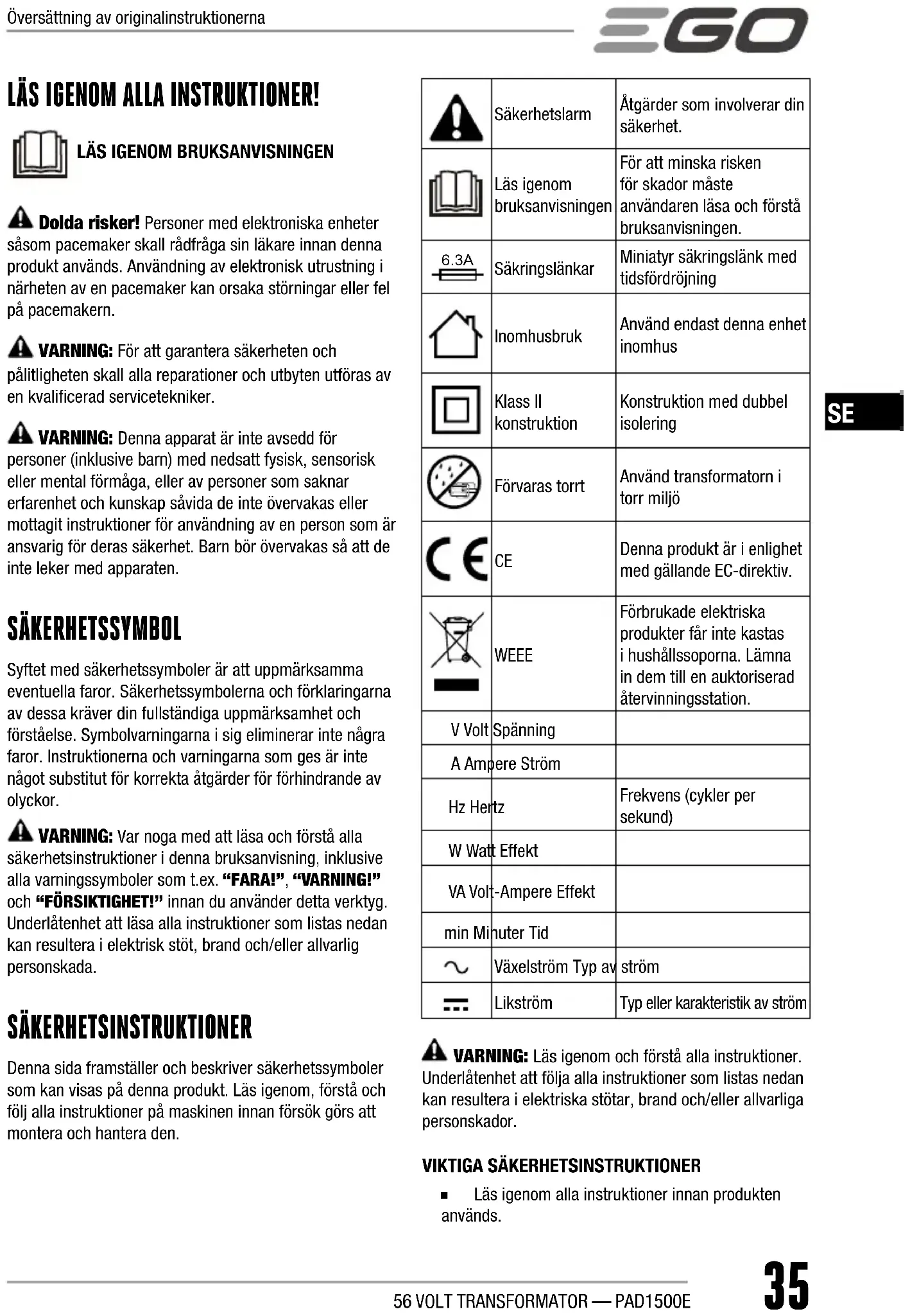 ◾ Läs igenom alla instruktioner innan produkten används.Översättning av originalinstruktionerna56 VOLT TRANSFORMATOR — PAD1500E36