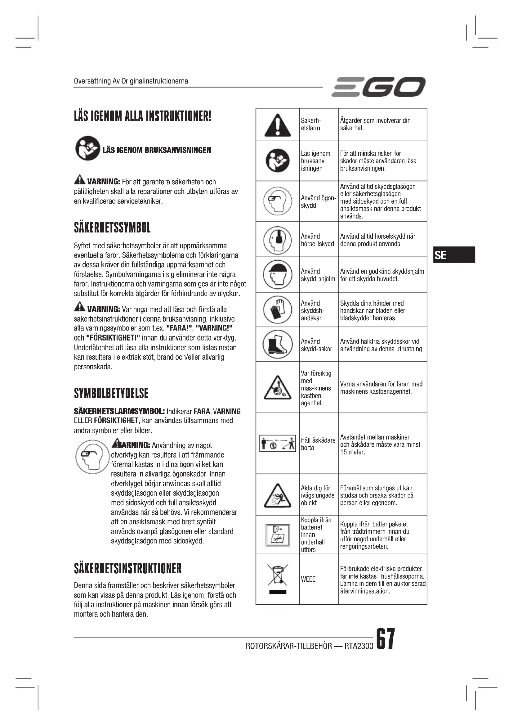 VARNING: För att garantera säkerheten och pålitligheten skall alla reparationer och utbyten utföras av en kvalicerad servicetekniker. SÄKERHETSSYMBOL Syftet med säkerhetssymboler är att uppmärksamma eventuella faror. Säkerhetssymbolerna och förklaringarna av dessa kräver din fullständiga uppmärksamhet och förståelse. Symbolvarningarna i sig eliminerar inte några faror. Instruktionerna och varningarna som ges är inte något substitut för korrekta åtgärder för förhindrande av olyckor. VARNING: Var noga med att läsa och förstå alla säkerhetsinstruktioner i denna bruksanvisning, inklusive alla varningssymboler som t.ex. "FARA!", "VARNING!" och "FÖRSIKTIGHET!" innan du använder detta verktyg. Underlåtenhet att läsa alla instruktioner som listas nedan kan resultera i elektrisk stöt, brand och/eller allvarlig personskada. SYMBOLBETYDELSE SÄKERHETSLARMSYMBOL: Indikerar FARA, VARNING ELLER FÖRSIKTIGHET, kan användas tillsammans med andra symboler eller bilder. VARNING: Användning av något elverktyg kan resultera i att främmande föremål kastas in i dina ögon vilket kan resultera in allvarliga ögonskador. Innan elverktyget börjar användas skall alltid skyddsglasögon eller skyddsglasögon med sidoskydd och full ansiktsskydd användas när så behövs. Vi rekommenderar att en ansiktsmask med brett synfält används ovanpå glasögonen eller standard skyddsglasögon med sidoskydd. SÄKERHETSINSTRUKTIONER Denna sida framställer och beskriver säkerhetssymboler som kan visas på denna produkt. Läs igenom, förstå och följ alla instruktioner på maskinen innan försök görs att montera och hantera den. Säkerh-etslarmÅtgärder som involverar din säkerhet.Läs igenom bruksanv-isningenFör att minska risken för skador måste användaren läsa bruksanvisningen.Använd ögon-skyddAnvänd alltid skyddsglasögon eller säkerhetsglasögon med sidoskydd och en full ansiktsmask när denna produkt används.Använd hörse-lskyddAnvänd alltid hörselskydd när denna produkt används.Använd skydd-shjälmAnvänd en godkänd skyddshjälm för att skydda huvudet.Använd skyddsh-andskarSkydda dina händer med handskar när bladen eller bladskyddet hanteras.Använd skydd-sskorAnvänd halkfria skyddsskor vid användning av denna utrustning.Var försiktig med mas-kinens kastben-ägenhetVarna användaren för faran med maskinens kastbenägenhet.Håll åskådare bortaAvståndet mellan maskinen och åskådare måste vara minst 15 meter.Akta dig för ivägslungade objektFöremål som slungas ut kan studsa och orsaka skador på person eller egendom.Koppla ifrån batteriet innan underhåll utförsKoppla ifrån batteripaketet från trådtrimmern innan du utför något underhåll eller rengöringsarbeten. WEEE Förbrukade elektriska produkter får inte kastas i hushållssoporna. Lämna in dem till en auktoriserad återvinningsstation. Översättning Av OriginalinstruktionernaROTORSKÄRAR-TILLBEHÖR — RTA230068