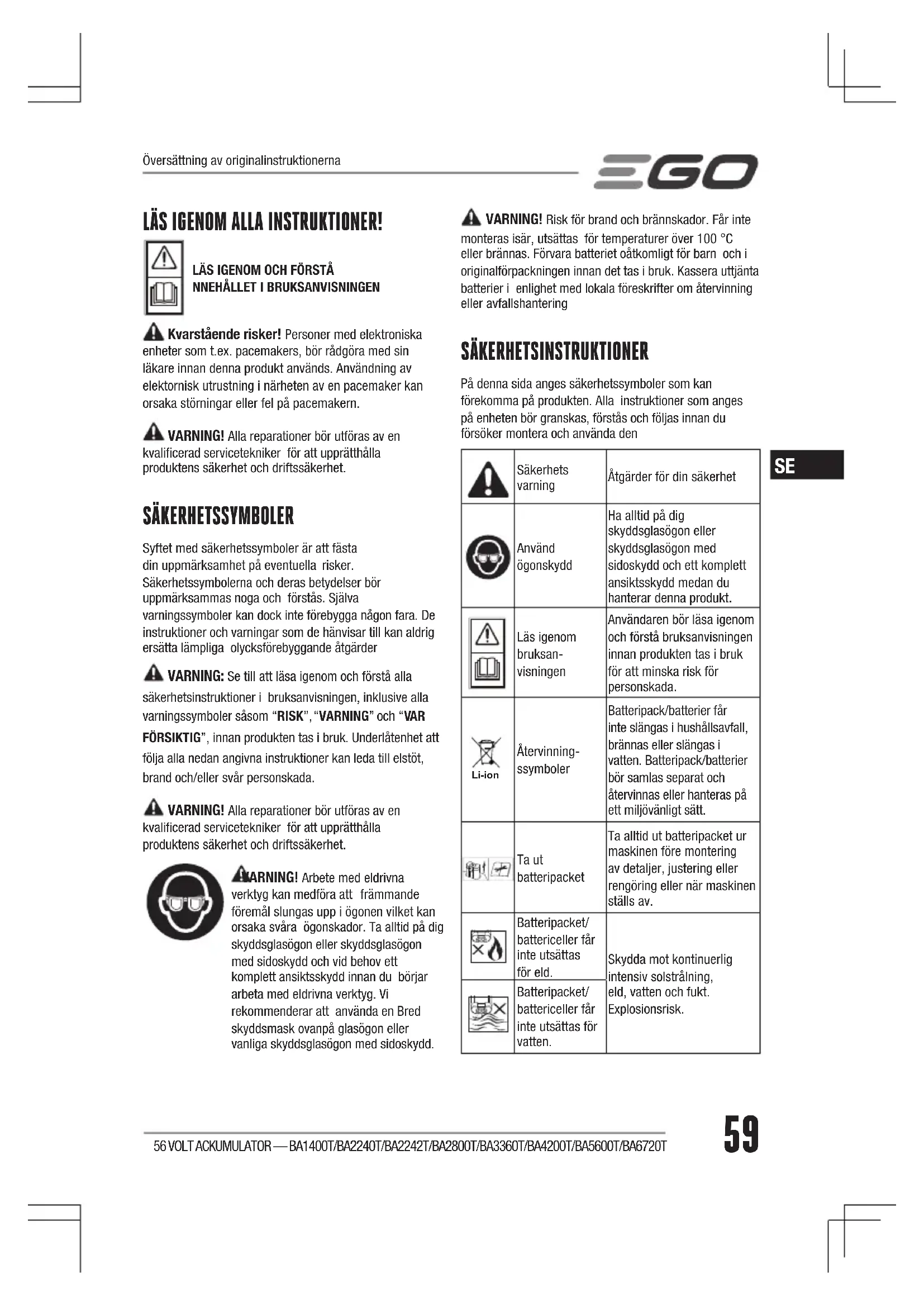 Kvarstående risker! Personer med elektroniska enheter som t.ex. pacemakers, bör rådgöra med sin läkare innan denna produkt används. Användning av elektornisk utrustning i närheten av en pacemaker kan orsaka störningar eller fel på pacemakern. VARNING! Alla reparationer bör utföras av en kvalificerad servicetekniker för att upprätthålla produktens säkerhet och driftssäkerhet. SÄKERHETSSYMBOLER Syftet med säkerhetssymboler är att fästa din uppmärksamhet på eventuella risker. Säkerhetssymbolerna och deras betydelser bör uppmärksammas noga och förstås. Själva varningssymboler kan dock inte förebygga någon fara. De instruktioner och varningar som de hänvisar till kan aldrig ersätta lämpliga olycksförebyggande åtgärder VARNING: Se till att läsa igenom och förstå alla säkerhetsinstruktioner i bruksanvisningen, inklusive alla varningssymboler såsom “RISK”, “VARNING” och “VAR FÖRSIKTIG”, innan produkten tas i bruk. Underlåtenhet att följa alla nedan angivna instruktioner kan leda till elstöt, brand och/eller svår personskada. VARNING! Alla reparationer bör utföras av en kvalificerad servicetekniker för att upprätthålla produktens säkerhet och driftssäkerhet. VARNING! Arbete med eldrivna verktyg kan medföra att främmande föremål slungas upp i ögonen vilket kan orsaka svåra ögonskador. Ta alltid på dig skyddsglasögon eller skyddsglasögon med sidoskydd och vid behov ett komplett ansiktsskydd innan du börjar arbeta med eldrivna verktyg. Vi rekommenderar att använda en Bred skyddsmask ovanpå glasögon eller vanliga skyddsglasögon med sidoskydd. VARNING! Risk för brand och brännskador. Får inte monteras isär, utsättas för temperaturer över 100 °C eller brännas. Förvara batteriet oåtkomligt för barn och i originalförpackningen innan det tas i bruk. Kassera uttjänta batterier i enlighet med lokala föreskrifter om återvinning eller avfallshantering SÄKERHETSINSTRUKTIONER På denna sida anges säkerhetssymboler som kan förekomma på produkten. Alla instruktioner som anges på enheten bör granskas, förstås och följas innan du försöker montera och använda den Säkerhets varning Åtgärder för din säkerhet Använd ögonskydd Ha alltid på dig skyddsglasögon eller skyddsglasögon med sidoskydd och ett komplett ansiktsskydd medan du hanterar denna produkt. Läs igenom bruksan- visningen Användaren bör läsa igenom och förstå bruksanvisningen innan produkten tas i bruk för att minska risk för personskada. Li-ion Återvinning- ssymboler Batteripack/batterier får inte slängas i hushållsavfall, brännas eller slängas i vatten. Batteripack/batterier bör samlas separat och återvinnas eller hanteras på ett miljövänligt sätt. Ta ut batteripacket Ta alltid ut batteripacket ur maskinen före montering av detaljer, justering eller rengöring eller när maskinen ställs av. Batteripacket/ battericeller får inte utsättas för eld. Skydda mot kontinuerlig intensiv solstrålning, eld, vatten och fukt. Explosionsrisk. Batteripacket/ battericeller får inte utsättas för vatten. Översättning av originalinstruktionerna56 VOLT ACKUMULATOR — BA1400T/BA2240T/BA2242T/BA2800T/BA3360T/BA4200T/BA5600T/BA6720T60