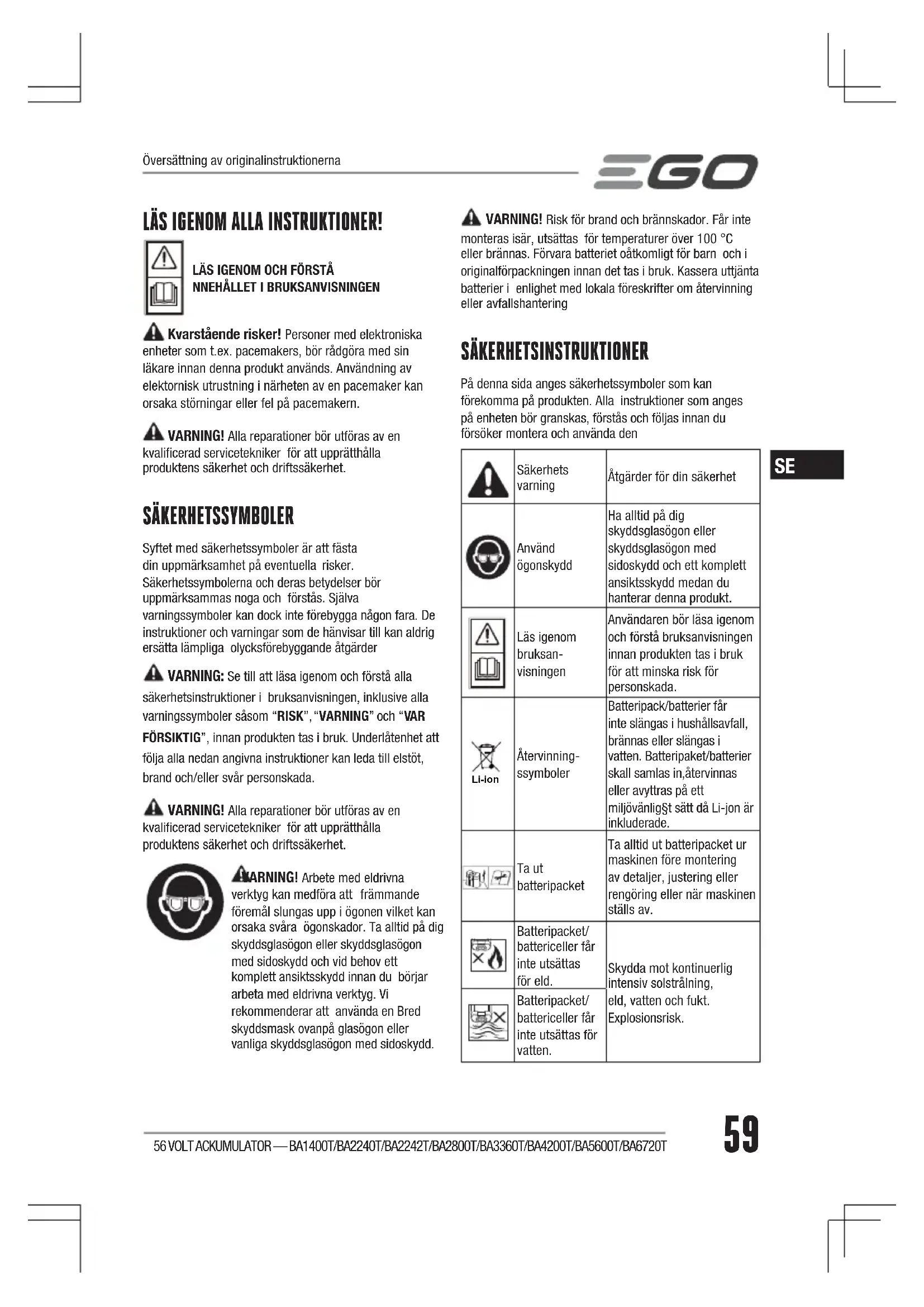 Kvarstående risker! Personer med elektroniska enheter som t.ex. pacemakers, bör rådgöra med sin läkare innan denna produkt används. Användning av elektornisk utrustning i närheten av en pacemaker kan orsaka störningar eller fel på pacemakern. VARNING! Alla reparationer bör utföras av en kvalificerad servicetekniker för att upprätthålla produktens säkerhet och driftssäkerhet. SÄKERHETSSYMBOLER Syftet med säkerhetssymboler är att fästa din uppmärksamhet på eventuella risker. Säkerhetssymbolerna och deras betydelser bör uppmärksammas noga och förstås. Själva varningssymboler kan dock inte förebygga någon fara. De instruktioner och varningar som de hänvisar till kan aldrig ersätta lämpliga olycksförebyggande åtgärder VARNING: Se till att läsa igenom och förstå alla säkerhetsinstruktioner i bruksanvisningen, inklusive alla varningssymboler såsom “RISK”, “VARNING” och “VAR FÖRSIKTIG”, innan produkten tas i bruk. Underlåtenhet att följa alla nedan angivna instruktioner kan leda till elstöt, brand och/eller svår personskada. VARNING! Alla reparationer bör utföras av en kvalificerad servicetekniker för att upprätthålla produktens säkerhet och driftssäkerhet. VARNING! Arbete med eldrivna verktyg kan medföra att främmande föremål slungas upp i ögonen vilket kan orsaka svåra ögonskador. Ta alltid på dig skyddsglasögon eller skyddsglasögon med sidoskydd och vid behov ett komplett ansiktsskydd innan du börjar arbeta med eldrivna verktyg. Vi rekommenderar att använda en Bred skyddsmask ovanpå glasögon eller vanliga skyddsglasögon med sidoskydd. VARNING! Risk för brand och brännskador. Får inte monteras isär, utsättas för temperaturer över 100 °C eller brännas. Förvara batteriet oåtkomligt för barn och i originalförpackningen innan det tas i bruk. Kassera uttjänta batterier i enlighet med lokala föreskrifter om återvinning eller avfallshantering SÄKERHETSINSTRUKTIONER På denna sida anges säkerhetssymboler som kan förekomma på produkten. Alla instruktioner som anges på enheten bör granskas, förstås och följas innan du försöker montera och använda den Säkerhets varning Åtgärder för din säkerhet Använd ögonskydd Ha alltid på dig skyddsglasögon eller skyddsglasögon med sidoskydd och ett komplett ansiktsskydd medan du hanterar denna produkt. Läs igenom bruksan- visningen Användaren bör läsa igenom och förstå bruksanvisningen innan produkten tas i bruk för att minska risk för personskada. Li-ion Återvinning- ssymboler Batteripack/batterier får inte slängas i hushållsavfall, brännas eller slängas i vatten. Batteripaket/batterier skall samlas in,återvinnas eller avyttras på ett miljövänlig§t sätt då Li-jon är inkluderade. Ta ut batteripacket Ta alltid ut batteripacket ur maskinen före montering av detaljer, justering eller rengöring eller när maskinen ställs av. Batteripacket/ battericeller får inte utsättas för eld. Skydda mot kontinuerlig intensiv solstrålning, eld, vatten och fukt. Explosionsrisk. Batteripacket/ battericeller får inte utsättas för vatten. Översättning av originalinstruktionerna56 VOLT ACKUMULATOR — BA1400T/BA2240T/BA2242T/BA2800T/BA3360T/BA4200T/BA5600T/BA6720T60