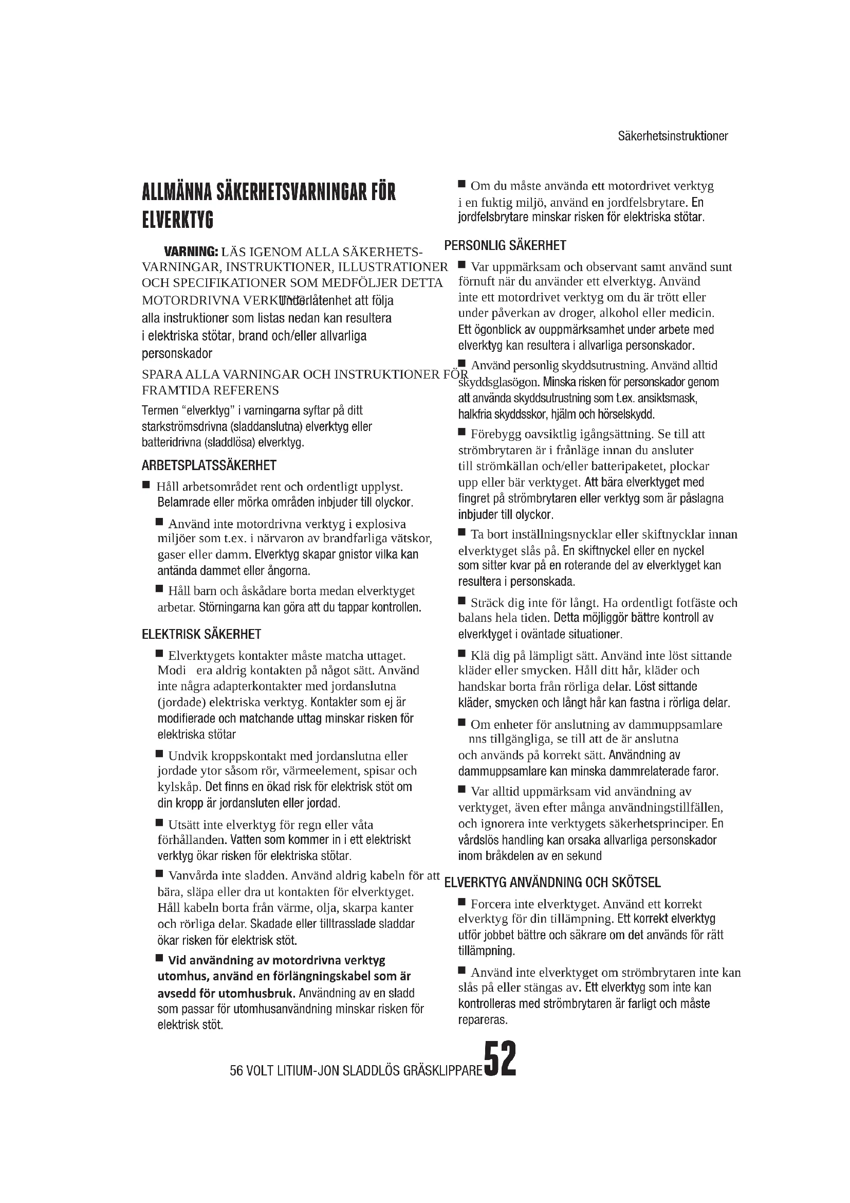 GRÄSKLIPPARE FARA: Denna maskin har byggts för att arbeta i enlighet med reglerna för säker drift som inkluderas i denna manual. Såsom med alla typer av elutrustning kan oförsiktighet eller fel hos operatören resultera i allvarliga skador. Denna maskin kan skadad händer och fötter och kasta iväg föremål. Underlåtenhet att följa dessa säkerhetsinstruktioner kan resultera i allvarlig skada eller dödsfall. VARNING: När sladdlösa gräsklipparen används skall grundläggande säkerhetsföreskrifter alltid följas för att minska risken för brand, elektriska faror och skador på personer.56 VOLT LITIUM-JON SLADDLÖS GRÄSKLIPPARE54