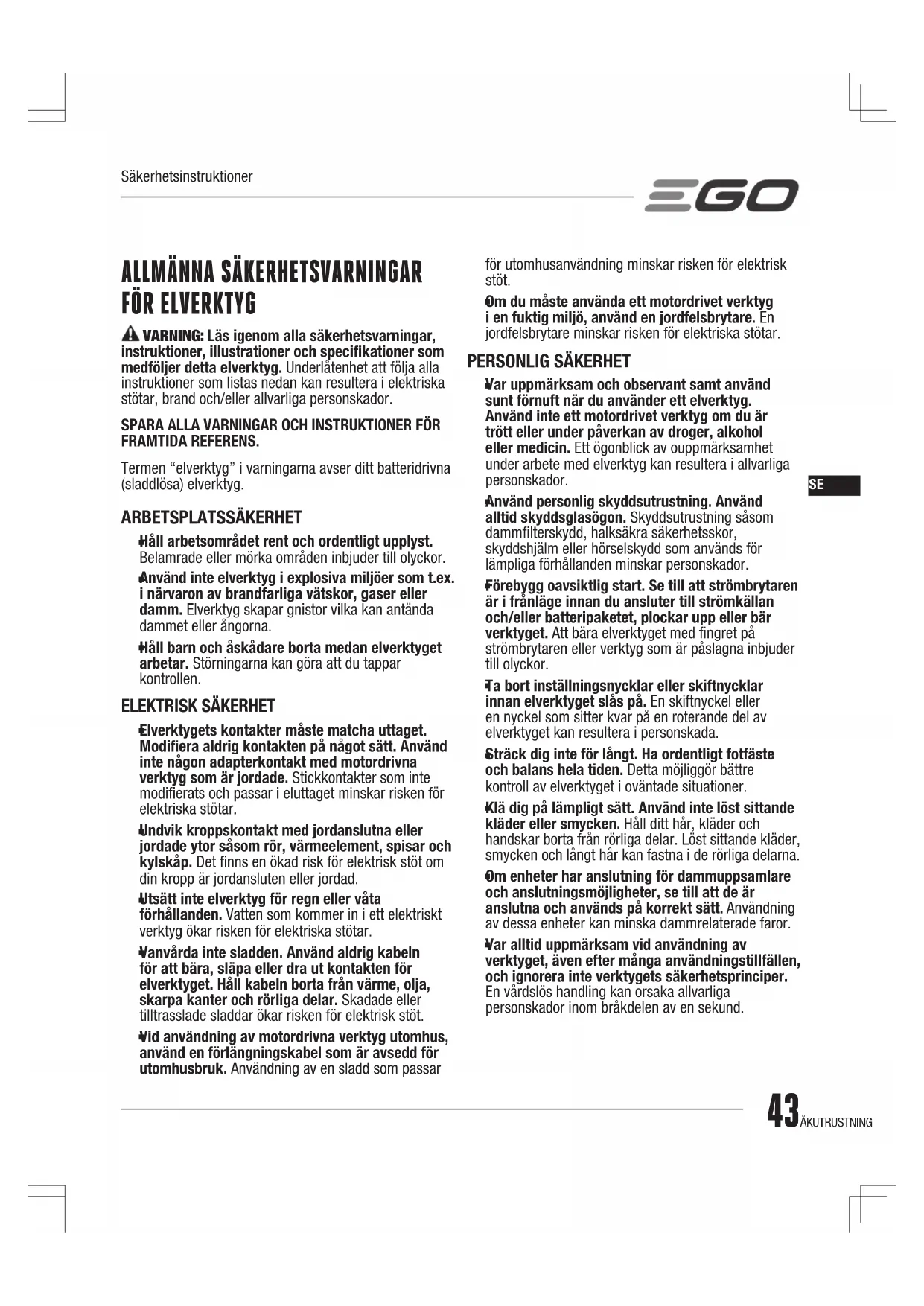 Om en situation som inte beskrivs i bruksanvisningen uppstår, använd försiktighet och gott omdöme. Kontakta EGO kundtjänst för hjälp.
