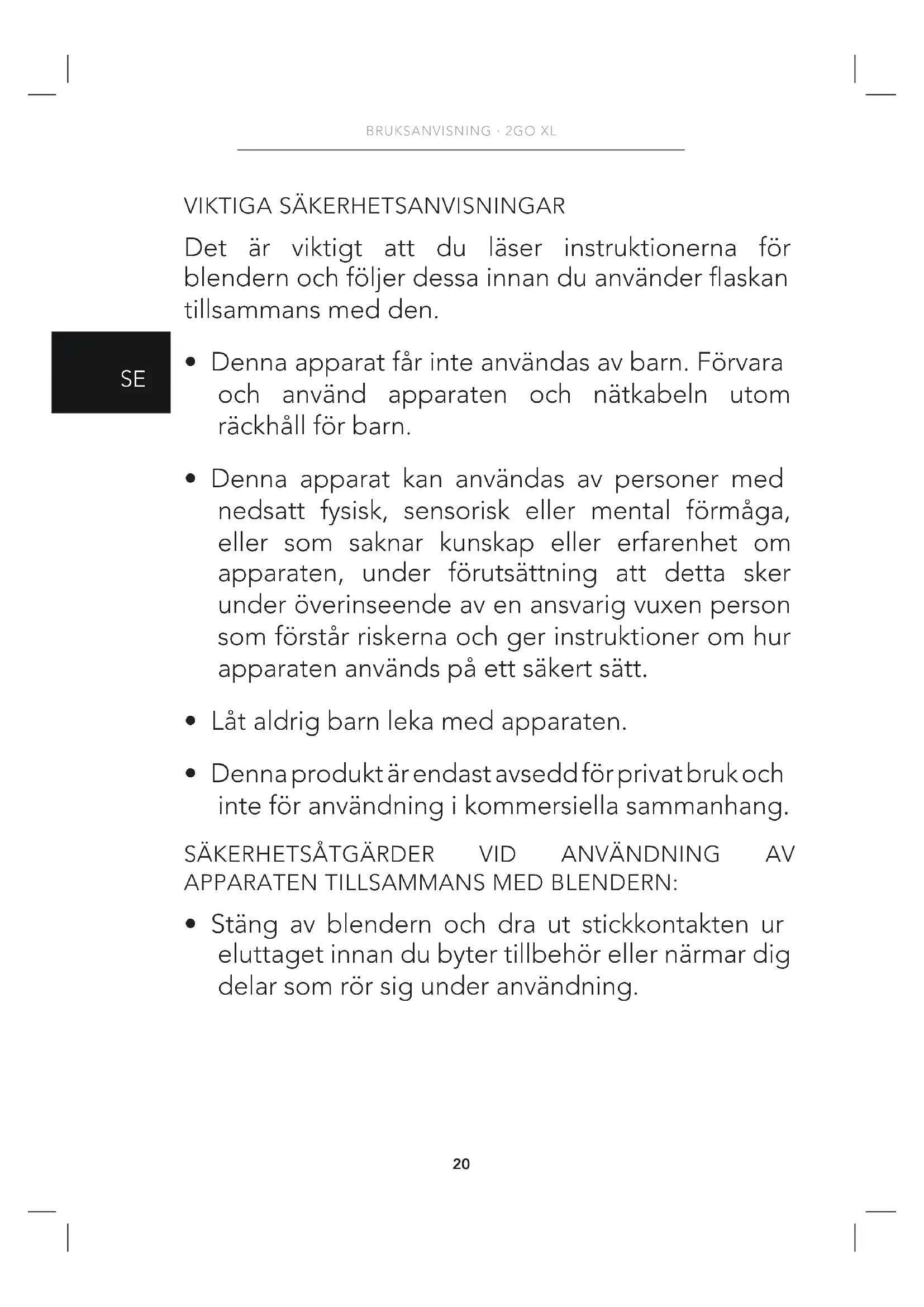 - Undvik att vidröra rörliga delar. Observera: Apparaten får inte köras längre tid än 3 minuter åt gången. Låt apparaten svalna till rumstemperatur innan den används igen. VARNING! 2Go-askan är endast lämplig för kalla ingredienser. Använd inte varma ingredienser.22