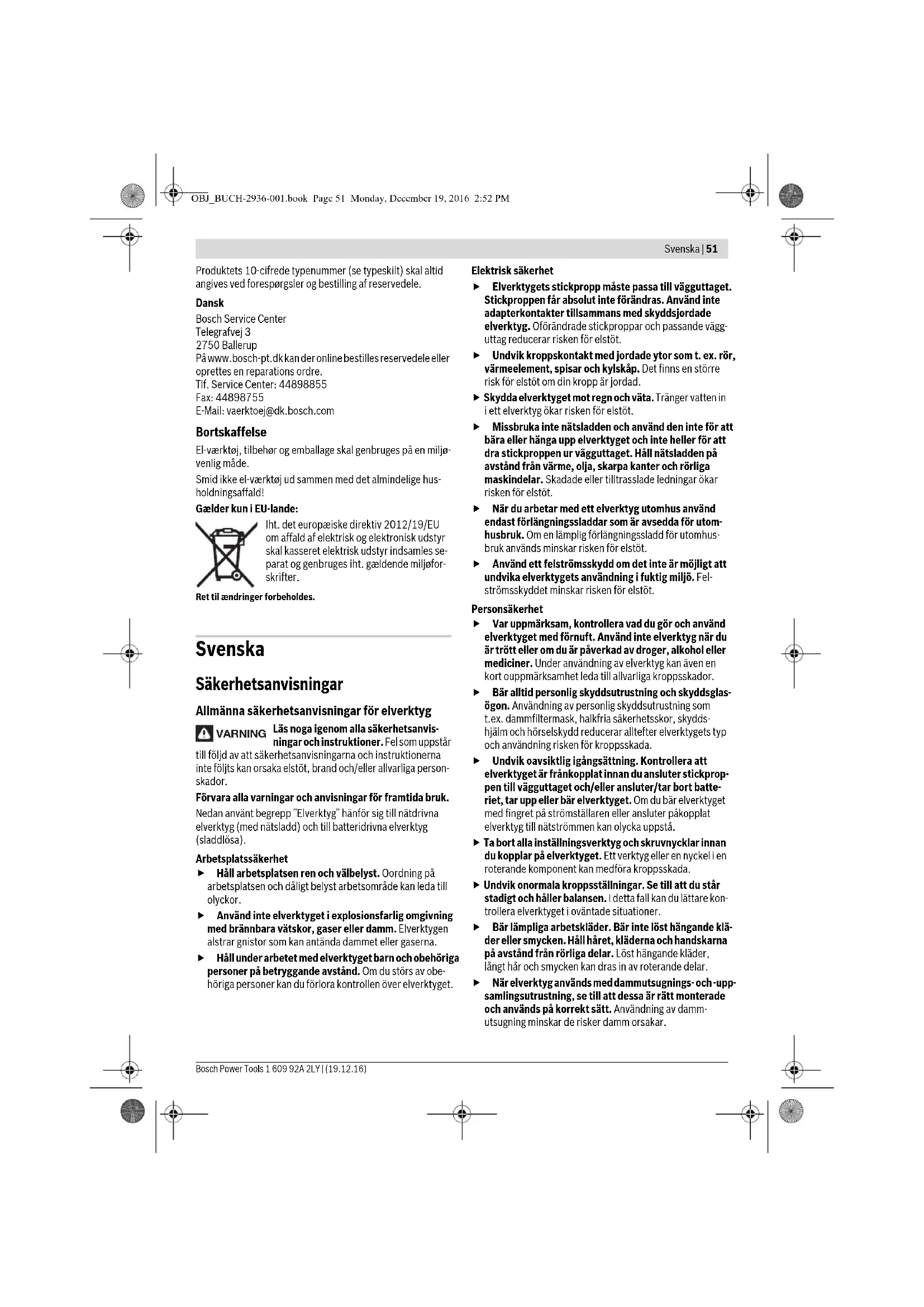 Hurtigfrakoblingen (Kickback Control) giver en bedre kontrol over el-værktøjet og forøger derved brugerbe- skyttelsen i forhold til el-værktøj uden Kickback Con- trol. Ved pludselig og uforudselig rotation af el-værktø- jet omkring borets akse slås el-værktøjet fra. Værktøjet tages i brug igen ved at slippe start-stop-kontak- ten og betjene den igen. Hvis funktionen KickBack Control er defekt, kan bore- maskinen ikke mere tændes. Sørg for, at el-værktøjet kun repareres af kvalificerede fagfolk, og at der kun benyttes originale reservedele. Omdrejningstal/slagtal indstilles Omdrejningstallet/slagtallet indstilles trinløst til det tændte el-værktøj, afhængigt af hvor meget start-stop-kontakten 6 trykkes ind. Let tryk på start-stop-kontakten 6 fører til et lavt omdrejnings- tal/slagtal. Med tiltagende tryk øges omdrejningstallet/slag- tallet. Omdrejningstal/slagtal vælges Stillehjulet til indstilling af omdrejningstallet 7 bruges til at indstille det nødvendige omdrejningstal/slagtal – også under driften. Det krævede omdrejningstal/slagtal afhænger af arbejdsma- terialet og arbejdsbetingelserne; det kan optimeres ved prak- tiske forsøg. Arbejdsvejledning Træk stikket ud af stikkontakten, før der udføres arbej- de på el-værktøjet. Sæt kun el-værktøjet på møtrikken/skruen i afbrudt til- stand. Roterende indsatsværktøjer kan skride. Efter længere tids arbejde med lille omdrejningstal skal værk- tøjet afkøles ved at lade det køre i ca. 3 minutter i ubelastet til- stand med max. omdrejningstal. Vedligeholdelse og service Vedligeholdelse og rengøring Træk stikket ud af stikkontakten, før der udføres arbej- de på el-værktøjet. El-værktøj og el-værktøjets ventilationsåbninger skal altid holdes rene for at sikre et godt og sikkert arbejde. Hvis det er nødvendigt at erstatte tilslutningsledningen, skal dette arbejde udføres af Bosch eller på et autoriseret service- værksted for Bosch el-værktøj for at undgå farer. Kundeservice og brugerrådgivning Kundeservice besvarer dine spørgsmål vedr. reparation og vedligeholdelse af dit produkt samt reservedele. Eksplosions- tegninger og informationer om reservedele findes også un- der: www.bosch-pt.com Bosch brugerrådgivningsteamet vil gerne hjælpe dig med at besvare spørgsmål vedr. vores produkter og deres tilbehør. OBJ_BUCH-2936-001.book Page 50 Monday, December 19, 2016 2:52 PMSvenska | 51 Bosch Power Tools 1 609 92A 2LY | (19.12.16) Produktets 10-cifrede typenummer (se typeskilt) skal altid angives ved forespørgsler og bestilling af reservedele. Dansk Bosch Service Center Telegrafvej 3 2750 Ballerup På www.bosch-pt.dk kan der online bestilles reservedele eller oprettes en reparations ordre. Tlf. Service Center: 44898855 Fax: 44898755 E-Mail: vaerktoej@dk.bosch.com Bortskaffelse El-værktøj, tilbehør og emballage skal genbruges på en miljø- venlig måde. Smid ikke el-værktøj ud sammen med det almindelige hus- holdningsaffald! Gælder kun i EU-lande: Iht. det europæiske direktiv 2012/19/EU om affald af elektrisk og elektronisk udstyr skal kasseret elektrisk udstyr indsamles se- parat og genbruges iht. gældende miljøfor- skrifter. Ret til ændringer forbeholdes. Svenska Säkerhetsanvisningar Allmänna säkerhetsanvisningar för elverktyg Läs noga igenom alla säkerhetsanvis- ningar och instruktioner. Fel som uppstår till följd av att säkerhetsanvisningarna och instruktionerna inte följts kan orsaka elstöt, brand och/eller allvarliga person- skador. Förvara alla varningar och anvisningar för framtida bruk. Nedan använt begrepp ”Elverktyg” hänför sig till nätdrivna elverktyg (med nätsladd) och till batteridrivna elverktyg (sladdlösa). Arbetsplatssäkerhet Håll arbetsplatsen ren och välbelyst. Oordning på arbetsplatsen och dåligt belyst arbetsområde kan leda till olyckor. Använd inte elverktyget i explosionsfarlig omgivning med brännbara vätskor, gaser eller damm. Elverktygen alstrar gnistor som kan antända dammet eller gaserna. Håll under arbetet med elverktyget barn och obehöriga personer på betryggande avstånd. Om du störs av obe- höriga personer kan du förlora kontrollen över elverktyget. Elektrisk säkerhet Elverktygets stickpropp måste passa till vägguttaget. Stickproppen får absolut inte förändras. Använd inte adapterkontakter tillsammans med skyddsjordade elverktyg. Oförändrade stickproppar och passande vägg- uttag reducerar risken för elstöt. Undvik kroppskontakt med jordade ytor som t. ex. rör, värmeelement, spisar och kylskåp. Det finns en större risk för elstöt om din kropp är jordad. Skydda elverktyget mot regn och väta. Tränger vatten in i ett elverktyg ökar risken för elstöt. Missbruka inte nätsladden och använd den inte för att bära eller hänga upp elverktyget och inte heller för att dra stickproppen ur vägguttaget. Håll nätsladden på avstånd från värme, olja, skarpa kanter och rörliga maskindelar. Skadade eller tilltrasslade ledningar ökar risken för elstöt. När du arbetar med ett elverktyg utomhus använd endast förlängningssladdar som är avsedda för utom- husbruk. Om en lämplig förlängningssladd för utomhus- bruk används minskar risken för elstöt. Använd ett felströmsskydd om det inte är möjligt att undvika elverktygets användning i fuktig miljö. Fel- strömsskyddet minskar risken för elstöt. Personsäkerhet Var uppmärksam, kontrollera vad du gör och använd elverktyget med förnuft. Använd inte elverktyg när du är trött eller om du är påverkad av droger, alkohol eller mediciner. Under användning av elverktyg kan även en kort ouppmärksamhet leda till allvarliga kroppsskador. Bär alltid personlig skyddsutrustning och skyddsglas- ögon. Användning av personlig skyddsutrustning som t.ex. dammfiltermask, halkfria säkerhetsskor, skydds- hjälm och hörselskydd reducerar alltefter elverktygets typ och användning risken för kroppsskada. Undvik oavsiktlig 