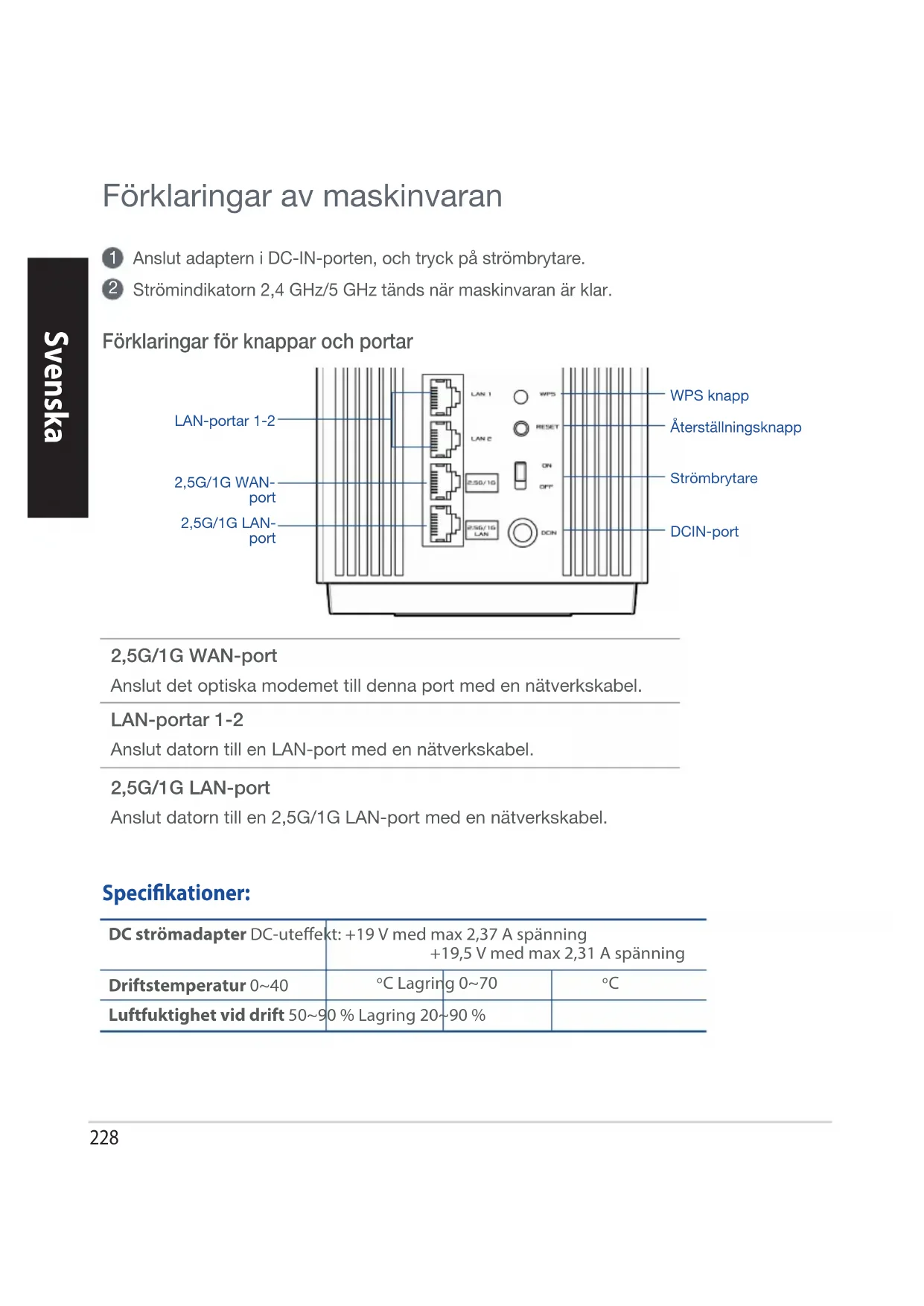 Anslut adaptern i DC-IN-porten, och tryck på strömbrytare. Strömindikatorn 2,4 GHz/5 GHz tänds när maskinvaran är klar. Förklaringar av maskinvaran Förklaringar för knappar och portar 2,5G/1G WAN-port Anslut det optiska modemet till denna port med en nätverkskabel. LAN-portar 1-2 Anslut datorn till en LAN-port med en nätverkskabel.DC strömadapter DC-uteekt: +19 V med max 2,37 A spänning +19,5 V med max 2,31 A spänningDriftstemperatur 0~40 C Lagring 0~70