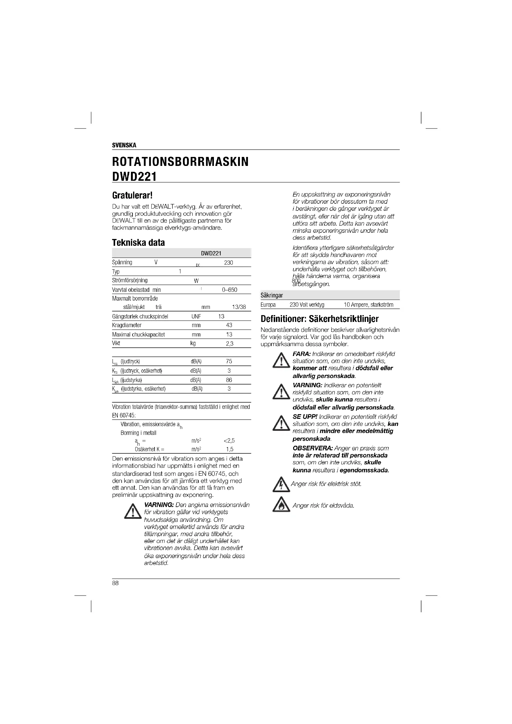 ROTATIONSBORRMASKIN DWD221 Gratulerar! Du har valt ett DEWALT-verktyg. År av erfarenhet, grundlig produktutveckling och innovation gör DEWALT till en av de pålitligaste partnerna för fackmannamässiga elverktygs-användare. Tekniska data DWD221 Spänning V