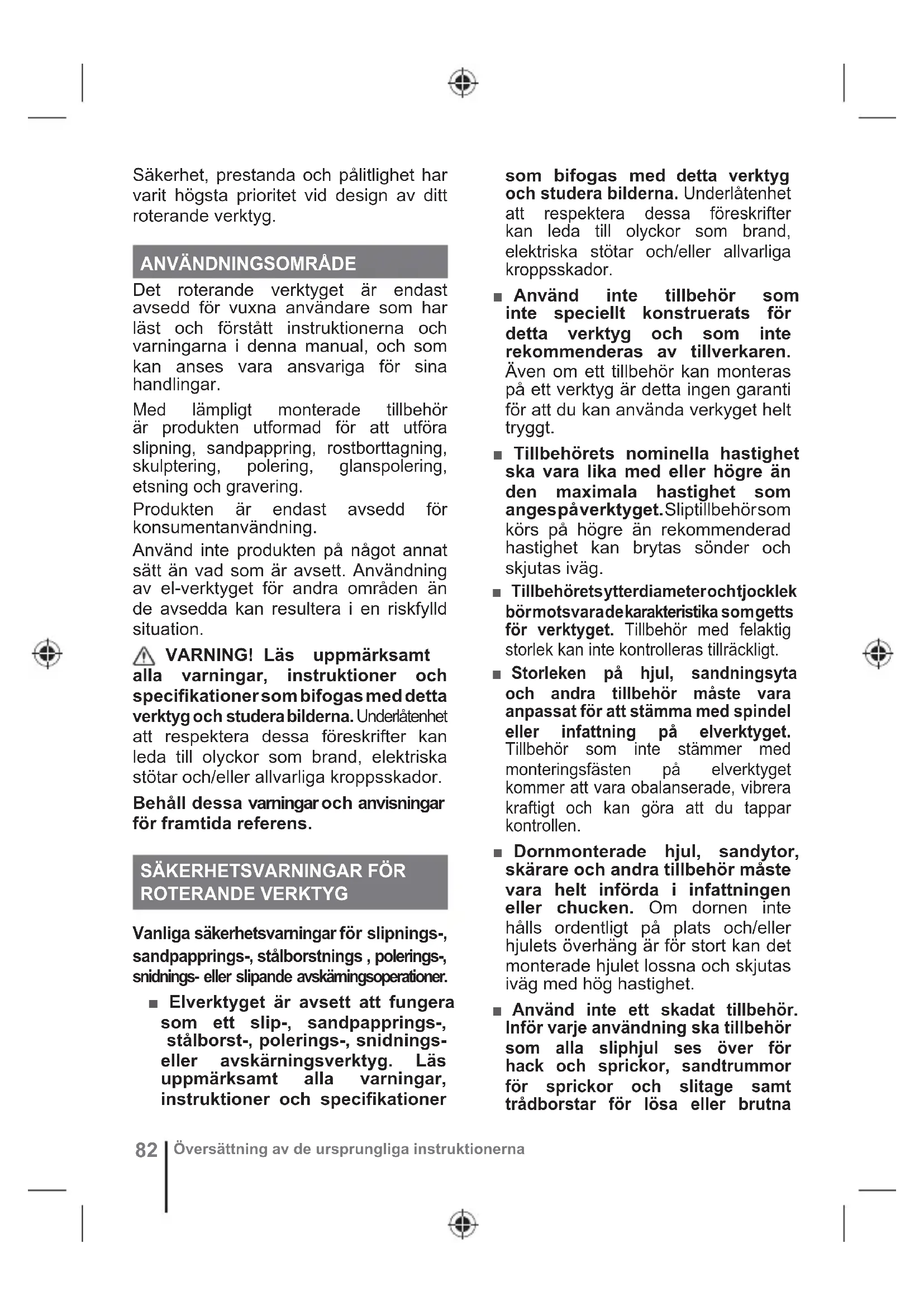 ROTERANDE VERKTYG Vanliga säkerhetsvarningar för slipnings-, sandpapprings-, stålborstnings , polerings-, snidnings- eller slipande avskärningsoperationer. ■ Elverktyget är avsett att fungera som ett slip-, sandpapprings-, stålborst-, polerings-, snidnings- eller avskärningsverktyg. Läs uppmärksamt alla varningar, instruktioner och specifikationer som bifogas med detta verktyg och studera bilderna. Underlåtenhet att respektera dessa föreskrifter kan leda till olyckor som brand, elektriska stötar och/eller allvarliga kroppsskador. ■ Använd inte tillbehör som inte speciellt konstruerats för detta verktyg och som inte rekommenderas av tillverkaren. Även om ett tillbehör kan monteras på ett verktyg är detta ingen garanti för att du kan använda verkyget helt tryggt. ■ Tillbehörets nominella hastighet ska vara lika med eller högre än den maximala hastighet som anges på verktyget. Sliptillbehör som körs på högre än rekommenderad hastighet kan brytas sönder och skjutas iväg. ■ Tillbehörets ytterdiameter och tjocklek bör motsvara de karakteristika som getts för verktyget. Tillbehör med felaktig storlek kan inte kontrolleras tillräckligt. ■ Storleken på hjul, sandningsyta och andra tillbehör måste vara anpassat för att stämma med spindel eller infattning på elverktyget. Tillbehör som inte stämmer med monteringsfästen på elverktyget kommer att vara obalanserade, vibrera kraftigt och kan göra att du tappar kontrollen. ■ Dornmonterade hjul, sandytor, skärare och andra tillbehör måste vara helt införda i infattningen eller chucken. Om dornen inte hålls ordentligt på plats och/eller hjulets överhäng är för stort kan det monterade hjulet lossna och skjutas iväg med hög hastighet. ■ Använd inte ett skadat tillbehör. Inför varje användning ska tillbehör som alla sliphjul ses över för hack och sprickor, sandtrummor för sprickor och slitage samt trådborstar för lösa eller brutna