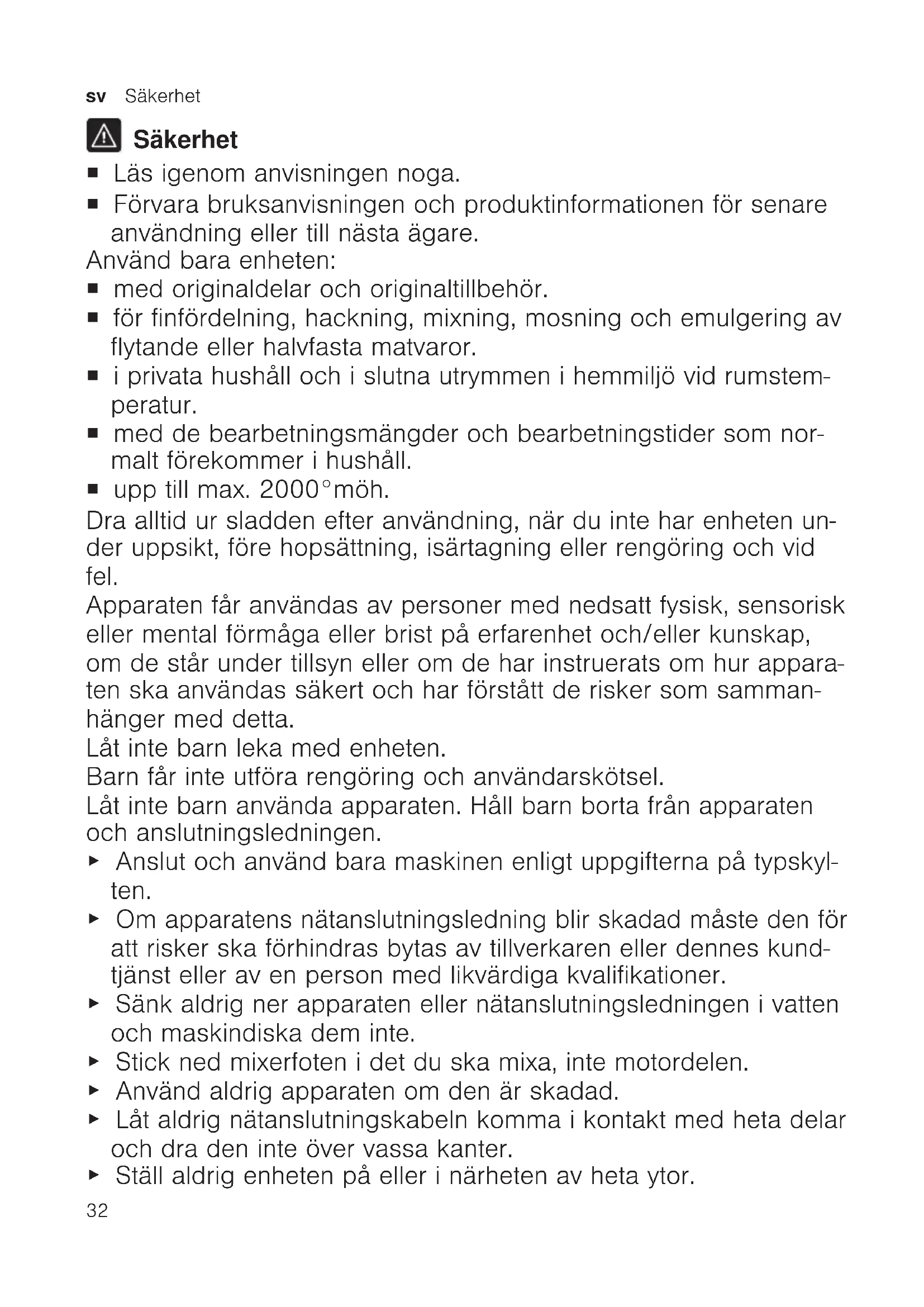 Säkerhet ¡ Läs igenom anvisningen noga. ¡ Förvara bruksanvisningen och produktinformationen för senare användning eller till nästa ägare. Använd bara enheten: ¡ med originaldelar och originaltillbehör. ¡ för finfördelning, hackning, mixning, mosning och emulgering av flytande eller halvfasta matvaror. ¡ i privata hushåll och i slutna utrymmen i hemmiljö vid rumstem- peratur. ¡ med de bearbetningsmängder och bearbetningstider som nor- malt förekommer i hushåll. ¡ upp till max. 2000°möh. Dra alltid ur sladden efter användning, när du inte har enheten un- der uppsikt, före hopsättning, isärtagning eller rengöring och vid fel. Apparaten får användas av personer med nedsatt fysisk, sensorisk eller mental förmåga eller brist på erfarenhet och/eller kunskap, om de står under tillsyn eller om de har instruerats om hur appara- ten ska användas säkert och har förstått de risker som samman- hänger med detta. Låt inte barn leka med enheten. Barn får inte utföra rengöring och användarskötsel. Låt inte barn använda apparaten. Håll barn borta från apparaten och anslutningsledningen. ▶ Anslut och använd bara maskinen enligt uppgifterna på typskyl- ten. ▶ Om apparatens nätanslutningsledning blir skadad måste den för att risker ska förhindras bytas av tillverkaren eller dennes kund- tjänst eller av en person med likvärdiga kvalifikationer. ▶ Sänk aldrig ner apparaten eller nätanslutningsledningen i vatten och maskindiska dem inte. ▶ Stick ned mixerfoten i det du ska mixa, inte motordelen. ▶ Använd aldrig apparaten om den är skadad. ▶ Låt aldrig nätanslutningskabeln komma i kontakt med heta delar och dra den inte över vassa kanter. ▶ Ställ aldrig enheten på eller i närheten av heta ytor.Undvika sakskador sv
