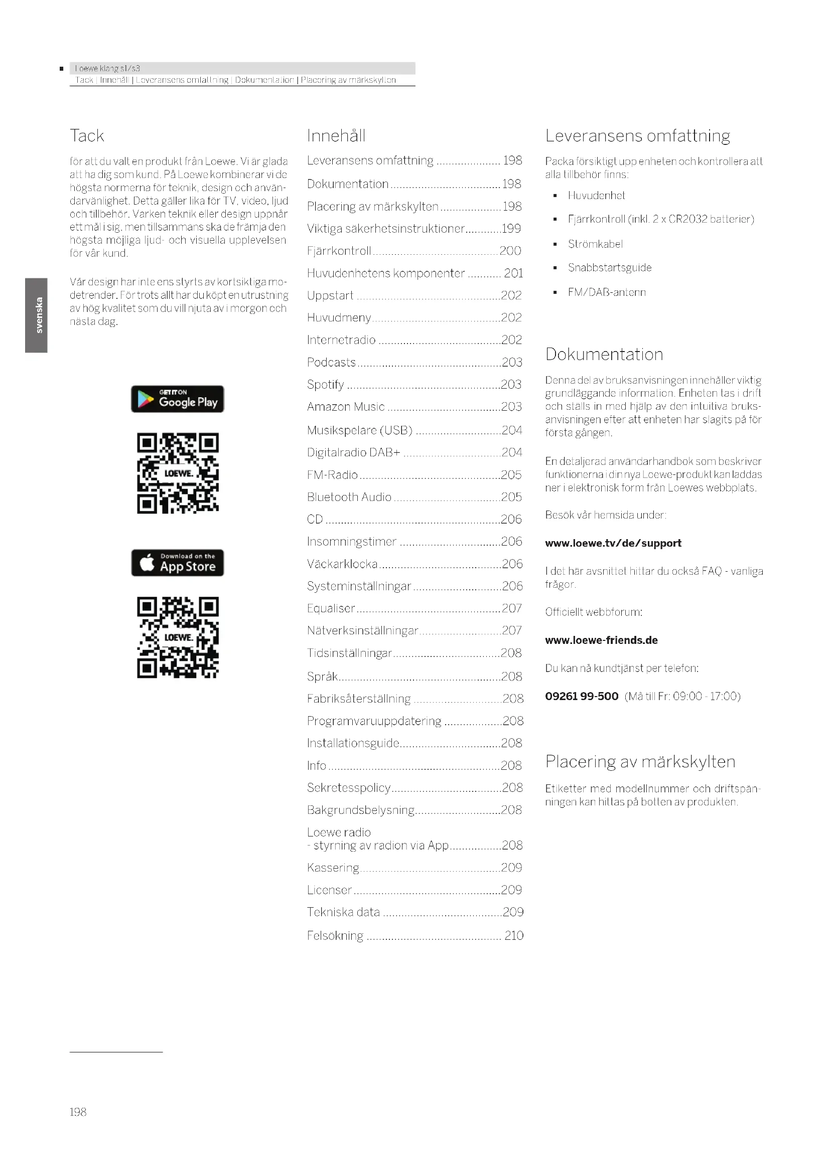 - Felsökning Leveransens omfattning Packa försiktigt upp enheten och kontrollera att alla tillbehör finns: Huvudenhet Fjärrkontroll (inkl. 2 x CR2032 batterier) Strömkabel Snabbstartsguide FM/DAB-antenn Dokumentation Denna del av bruksanvisningen innehåller viktig grundläggande information. Enheten tas i drift och ställs in med hjälp av den intuitiva bruks- anvisningen efter att enheten har slagits på för första gången. En detaljerad användarhandbok som beskriver funktionerna i din nya Loewe-produkt kan laddas ner i elektronisk form från Loewes webbplats. Besök vår hemsida under: www.loewe.tv/de/support I det här avsnittet hittar du också FAQ - vanliga frågor. Officiellt webbforum: www.loewe-friends.de Du kan nå kundtjänst per telefon: 09261 99-500 (Må till Fr: 09:00 - 17:00) Placering av märkskylten Etiketter med modellnummer och driftspän- ningen kan hittas på botten av produkten.199 p. 210