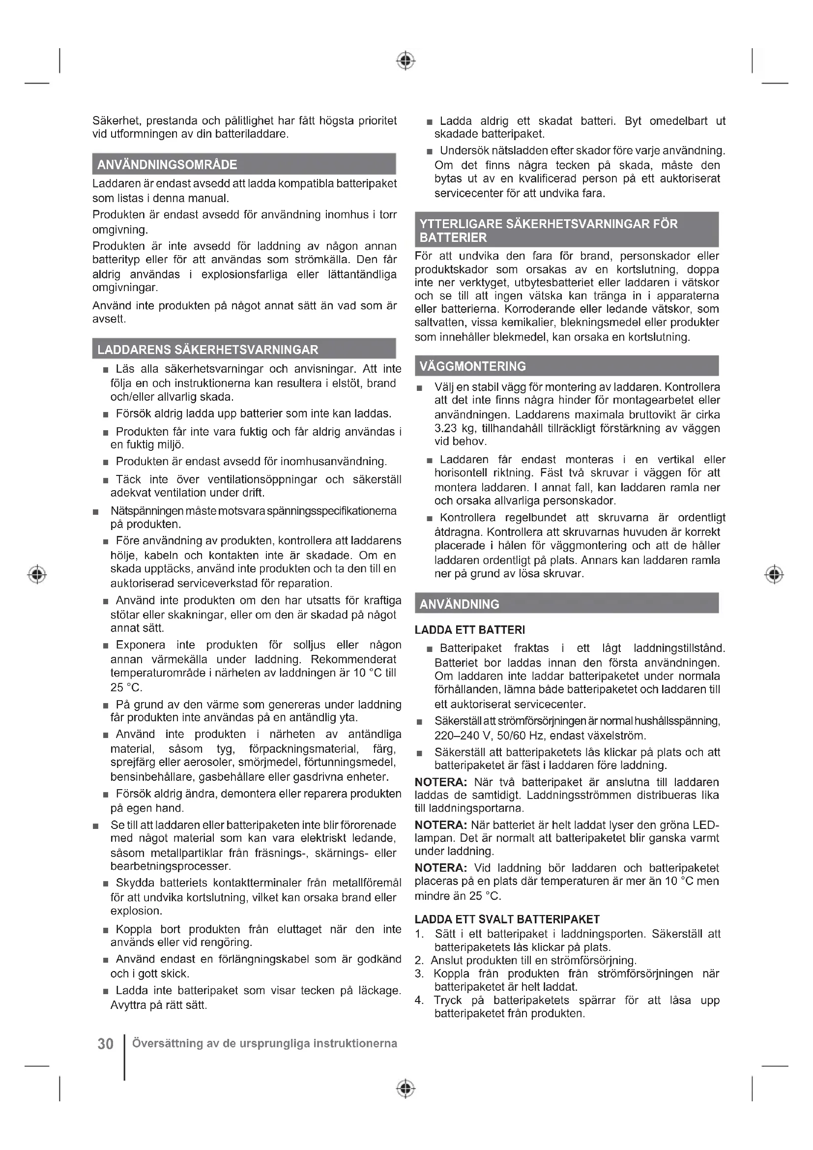 Laddaren är endast avsedd att ladda kompatibla batteripaket som listas i denna manual. Produkten är endast avsedd för användning inomhus i torr omgivning. Produkten är inte avsedd för laddning av någon annan batterityp eller för att användas som strömkälla. Den får aldrig användas i explosionsfarliga eller lättantändliga omgivningar. Använd inte produkten på något annat sätt än vad som är avsett.