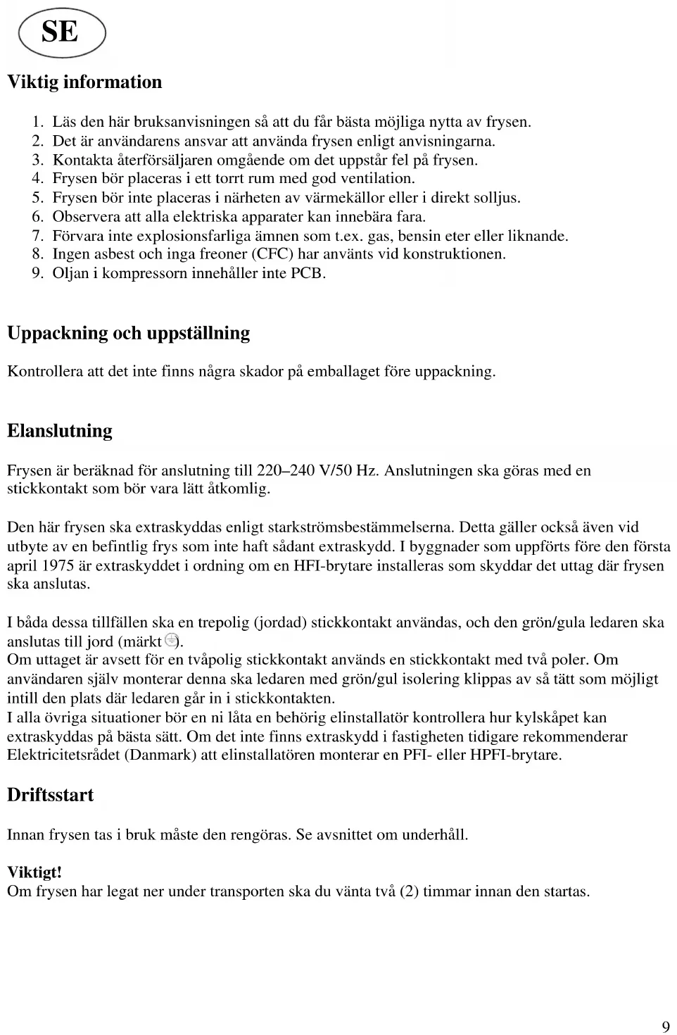 Elanslutning Frysen är beräknad för anslutning till 220–240 V/50 Hz. Anslutningen ska göras med en stickkontakt som bör vara lätt åtkomlig. Den här frysen ska extraskyddas enligt starkströmsbestämmelserna. Detta gäller också även vid utbyte av en befintlig frys som inte haft sådant extraskydd. I byggnader som uppförts före den första april 1975 är extraskyddet i ordning om en HFI-brytare installeras som skyddar det uttag där frysen ska anslutas. I båda dessa tillfällen ska en trepolig (jordad) stickkontakt användas, och den grön/gula ledaren ska anslutas till jord (märkt ). Om uttaget är avsett för en tvåpolig stickkontakt används en stickkontakt med två poler. Om användaren själv monterar denna ska ledaren med grön/gul isolering klippas av så tätt som möjligt intill den plats där ledaren går in i stickkontakten. I alla övriga situationer bör en ni låta en behörig elinstallatör kontrollera hur kylskåpet kan extraskyddas på bästa sätt. Om det inte finns extraskydd i fastigheten tidigare rekommenderar Elektricitetsrådet (Danmark) att elinstallatören monterar en PFI- eller HPFI-brytare. Driftsstart Innan frysen tas i bruk måste den rengöras. Se avsnittet om underhåll. Viktigt! Om frysen har legat ner under transporten ska du vänta två (2) timmar innan den startas.