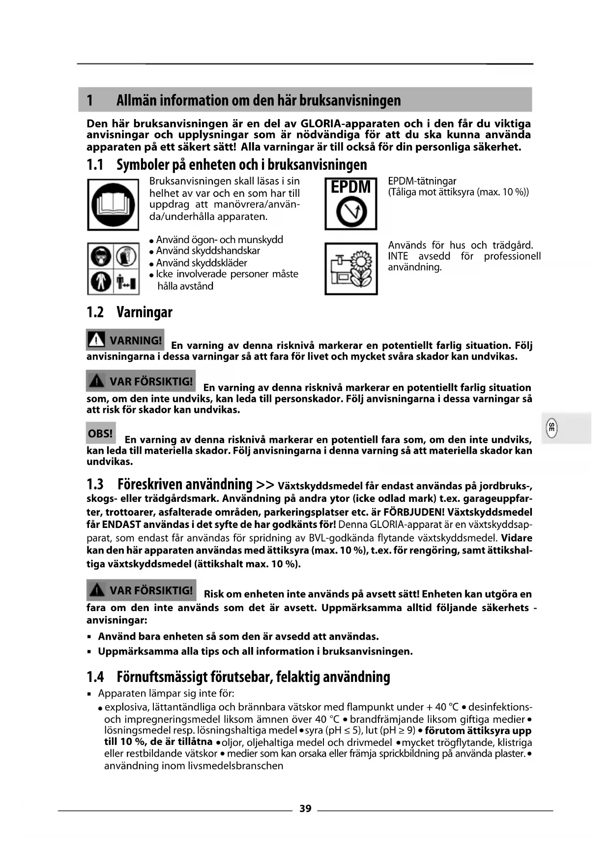 skogs- eller trädgårdsmark. Användning på andra ytor (icke odlad mark) t.ex. garageuppfar- ter, trottoarer, asfalterade områden, parkeringsplatser etc. är FÖRBJUDEN! Växtskyddsmedel får ENDAST användas i det syfte de har godkänts för! Denna GLORIA-apparat är en växtskyddsap- parat, som endast får användas för spridning av BVL-godkända flytande växtskyddsmedel. Vidare kan den här apparaten användas med ättiksyra (max. 10 %), t.ex. för rengöring, samt ättikshal- tiga växtskyddsmedel (ättikshalt max. 10 %). Risk om enheten inte används på avsett sätt! Enheten kan utgöra en fara om den inte används som det är avsett. Uppmärksamma alltid följande säkerhets - anvisningar: