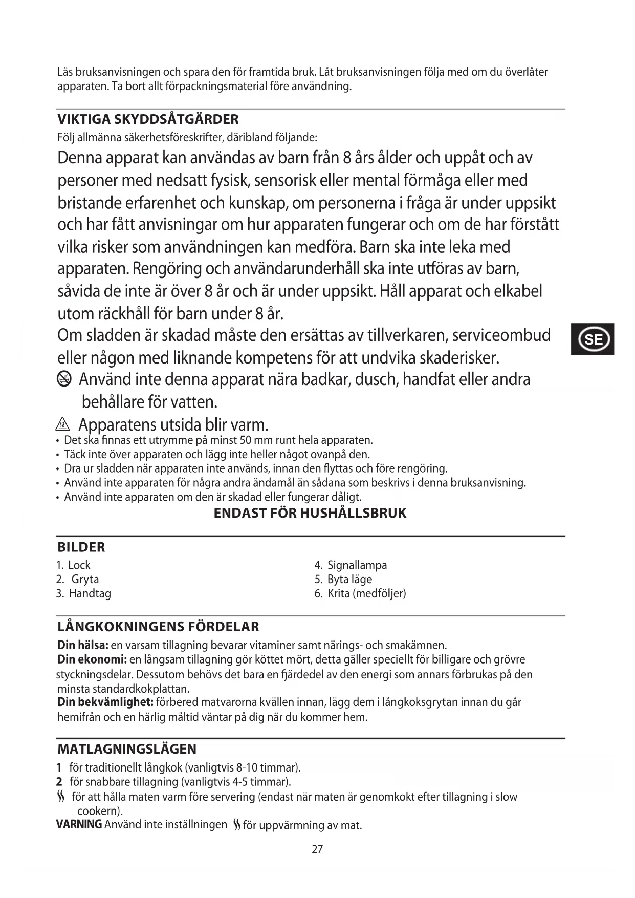 Denna apparat kan användas av barn fran 8 árden och uppåt och av personer med nedsatt fysisik, sensorisk eller mental formåga eller med bristande erfarenhet och kunskap, om personerna i fråga ar under uppsikt och har fätt anvisningar om hur apparaten fungerar och om de har Förstätt vilka risker som användningen kan medföra. Barn sk inte leka med apparaten. Rengöring och användarunderhäll sk inte utforas av barn, sävida de inte ar over 8 ár och ar under uppsikt. Häll apparat och elkabel utom räckhäll for barn under 8 ár.