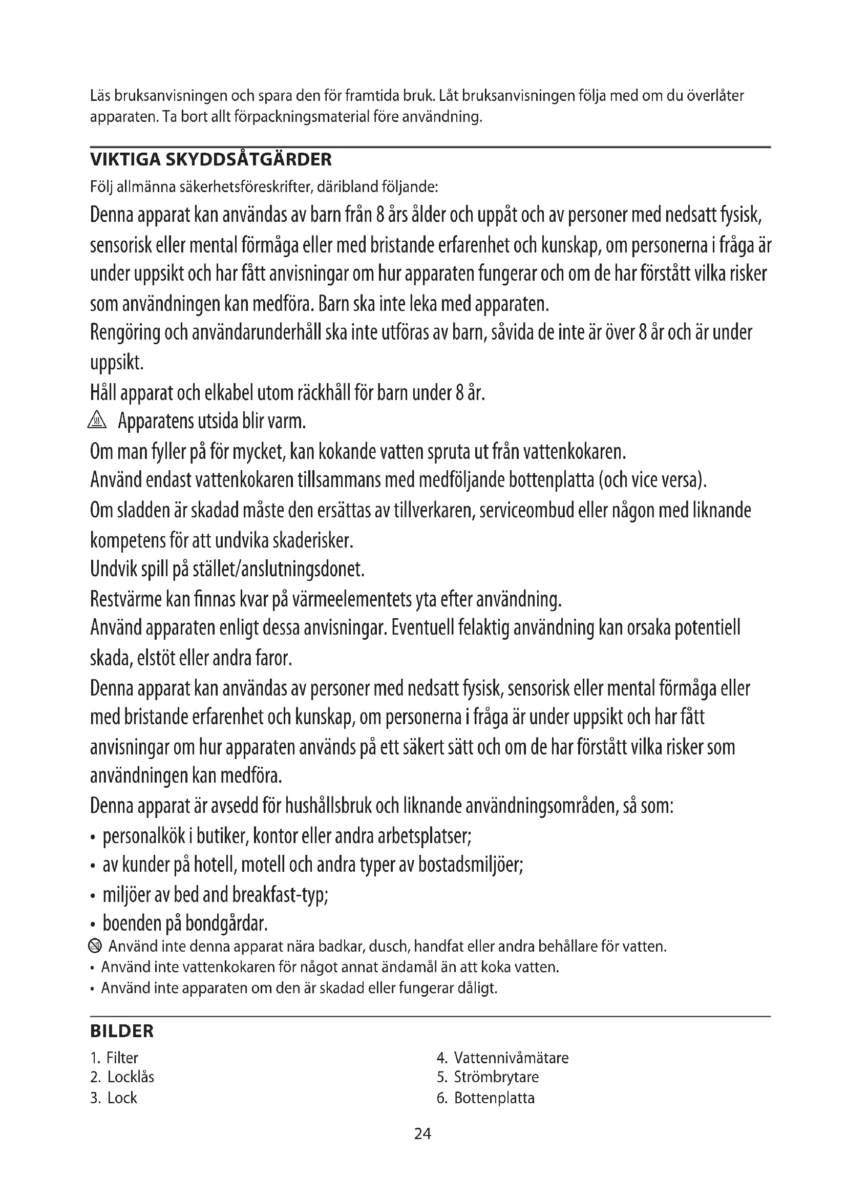 Följ allmänna säkerhetsföreskrifter, däribland följande: Denna apparat kan användas av barn från 8 års ålder och uppåt och av personer med nedsatt fysisk, sensorisk eller mental förmåga eller med bristande erfarenhet och kunskap, om personerna i fråga är under uppsikt och har fått anvisningar om hur apparaten fungerar och om de har förstått vilka risker som användningen kan medföra. Barn ska inte leka med apparaten. Rengöring och användarunderhåll ska inte utföras av barn, såvida de inte är över 8 år och är under uppsikt. Håll apparat och elkabel utom räckhåll för barn under 8 år. h Apparatens utsida blir varm. Om man fyller på för mycket, kan kokande vatten spruta ut från vattenkokaren. Använd endast vattenkokaren tillsammans med medföljande bottenplatta (och vice versa). Om sladden är skadad måste den ersättas av tillverkaren, serviceombud eller någon med liknande kompetens för att undvika skaderisker. Undvik spill på stället/anslutningsdonet. Restvärme kan finnas kvar på värmeelementets yta efter användning. Använd apparaten enligt dessa anvisningar. Eventuell felaktig användning kan orsaka potentiell skada, elstöt eller andra faror. Denna apparat kan användas av personer med nedsatt fysisk, sensorisk eller mental förmåga eller med bristande erfarenhet och kunskap, om personerna i fråga är under uppsikt och har fått anvisningar om hur apparaten används på ett säkert sätt och om de har förstått vilka risker som användningen kan medföra. Denna apparat är avsedd för hushållsbruk och liknande användningsområden, så som: