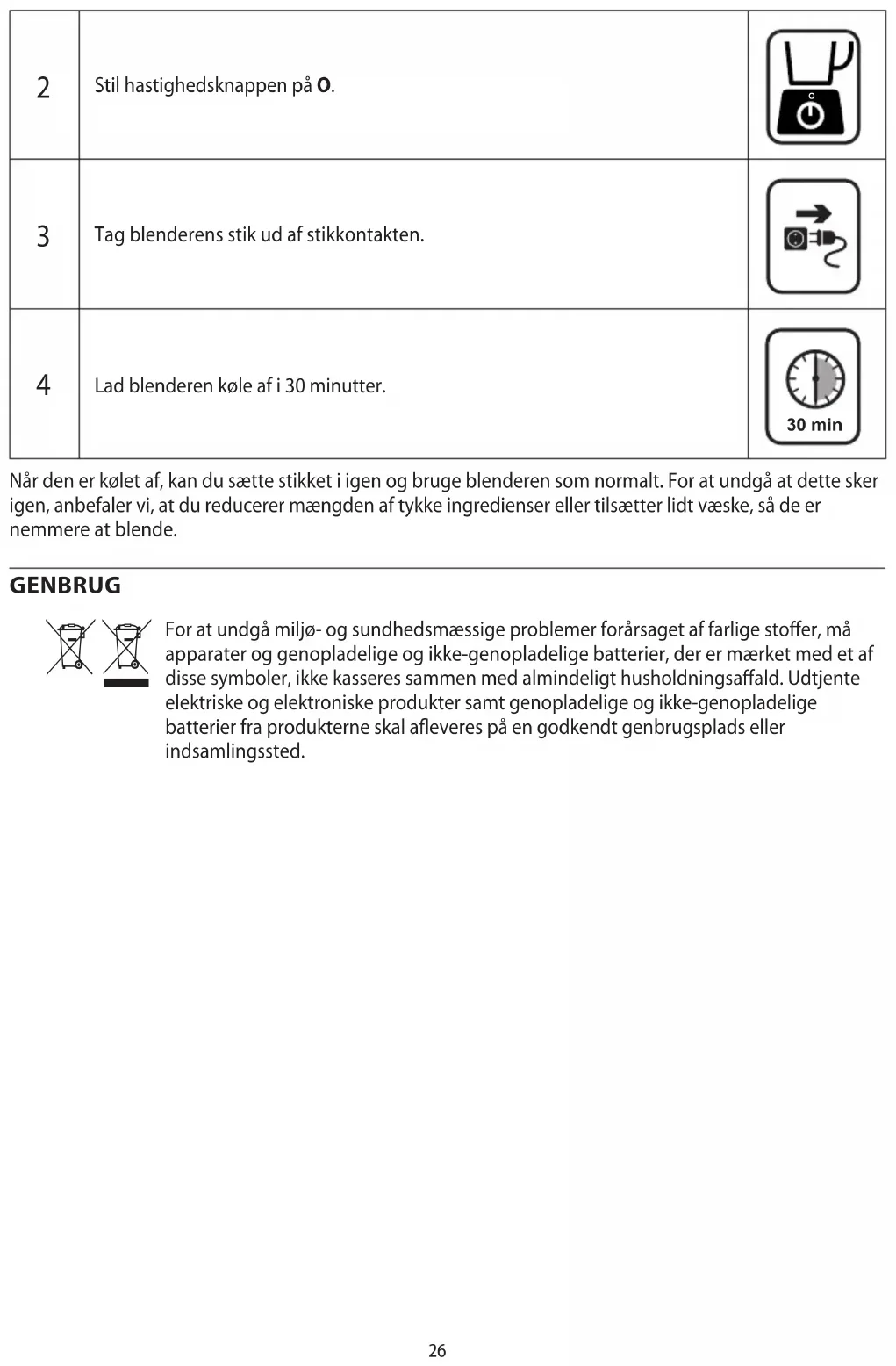 Låt mixern svalna i 30 min. 30 min När den har svalnat kan du koppla in din mixer igen och använda den som vanligt. För att förhindra att detta händer igen rekommenderar vi att man minskar mängden kraftiga ingredienser eller tillsätter lite vätska för att underlätta mixningen. ÅTERVINNING