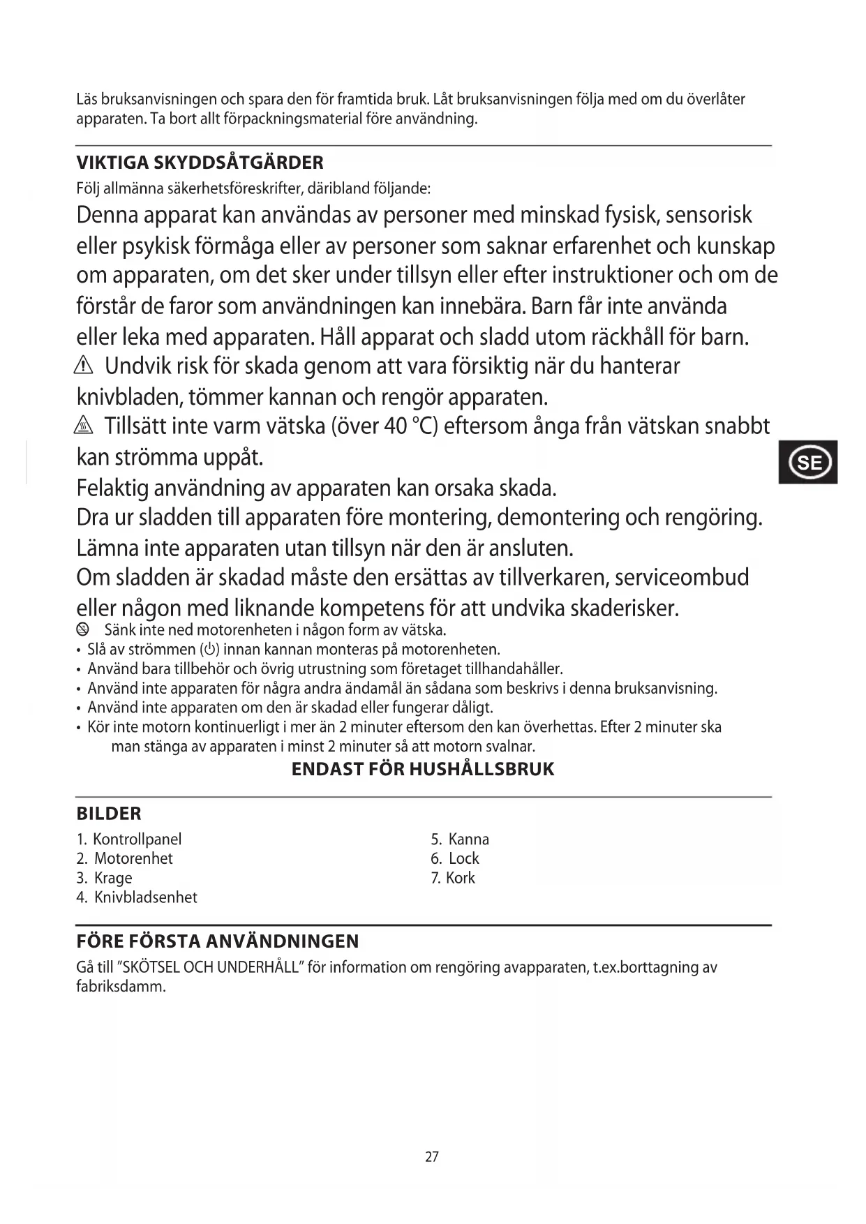 Följ allmänna säkerhetsföreskrifter, däribland följande: Denna apparat kan användas av personer med minskad fysisk, sensorisk eller psykisk förmåga eller av personer som saknar erfarenhet och kunskap om apparaten, om det sker under tillsyn eller efter instruktioner och om de förstår de faror som användningen kan innebära. Barn får inte använda eller leka med apparaten. Håll apparat och sladd utom räckhåll för barn. c Undvik risk för skada genom att vara försiktig när du hanterar knivbladen, tömmer kannan och rengör apparaten. h Tillsätt inte varm vätska (över 40 °C) eftersom ånga från vätskan snabbt kan strömma uppåt. Felaktig användning av apparaten kan orsaka skada. Dra ur sladden till apparaten före montering, demontering och rengöring. Lämna inte apparaten utan tillsyn när den är ansluten. Om sladden är skadad måste den ersättas av tillverkaren, serviceombud eller någon med liknande kompetens för att undvika skaderisker. l Sänk inte ned motorenheten i någon form av vätska.