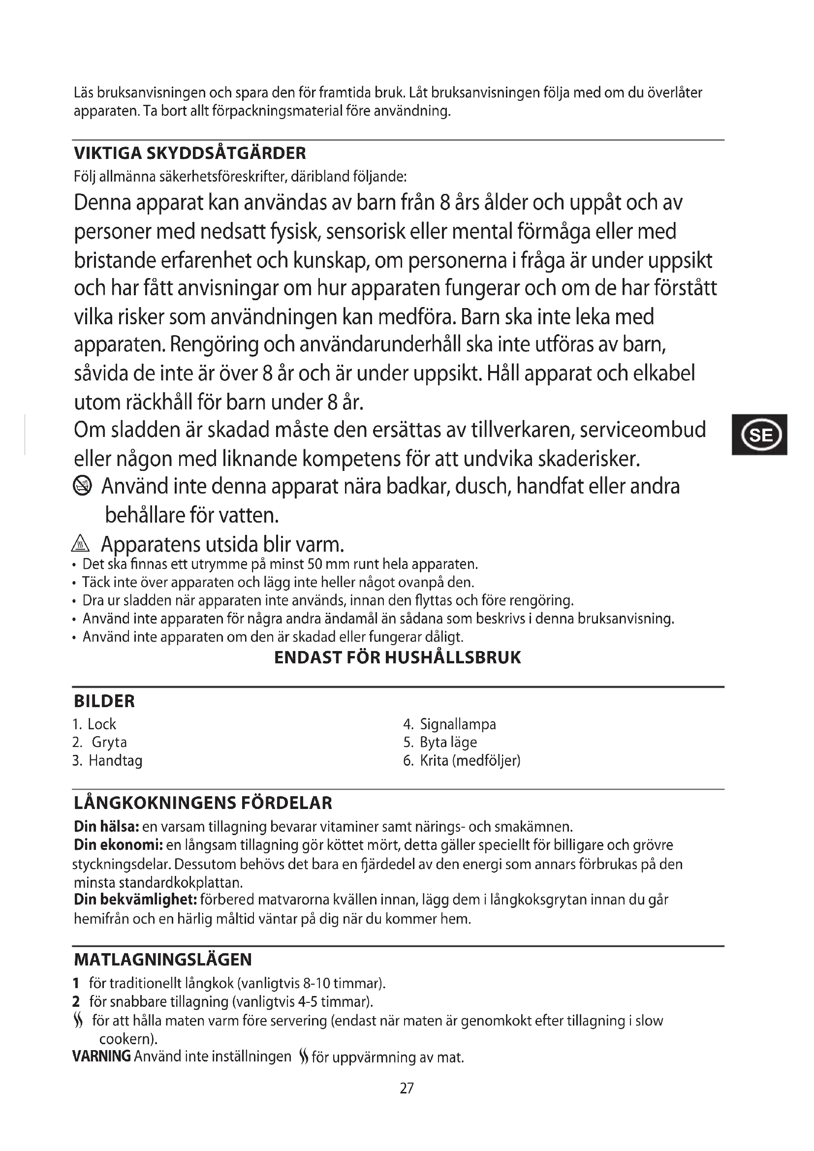 Din hälsa: en varsam tillagning bevarar vitaminer samt närings- och smakämnen. Din ekonomi: en långsam tillagning gör köttet mört, detta gäller speciellt för billigare och grövre styckningsdelar. Dessutom behövs det bara en ärdedel av den energi som annars förbrukas på den minsta standardkokplattan. Din bekvämlighet: förbered matvarorna kvällen innan, lägg dem i långkoksgrytan innan du går hemifrån och en härlig måltid väntar på dig när du kommer hem. MATLAGNINGSLÄGEN 1 för traditionellt långkok (vanligtvis 8-10 timmar). 2 för snabbare tillagning (vanligtvis 4-5 timmar).