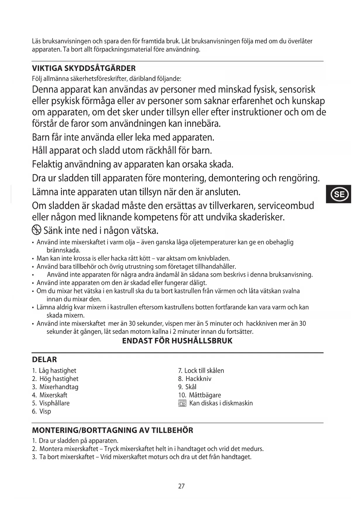 Följ allmänna säkerhetsföreskrifter, däribland följande: Denna apparat kan användas av personer med minskad fysisk, sensorisk eller psykisk förmåga eller av personer som saknar erfarenhet och kunskap om apparaten, om det sker under tillsyn eller efter instruktioner och om de förstår de faror som användningen kan innebära. Barn får inte använda eller leka med apparaten. Håll apparat och sladd utom räckhåll för barn. Felaktig användning av apparaten kan orsaka skada. Dra ur sladden till apparaten före montering, demontering och rengöring. Lämna inte apparaten utan tillsyn när den är ansluten. Om sladden är skadad måste den ersättas av tillverkaren, serviceombud eller någon med liknande kompetens för att undvika skaderisker. i Sänk inte ned i någon vätska.