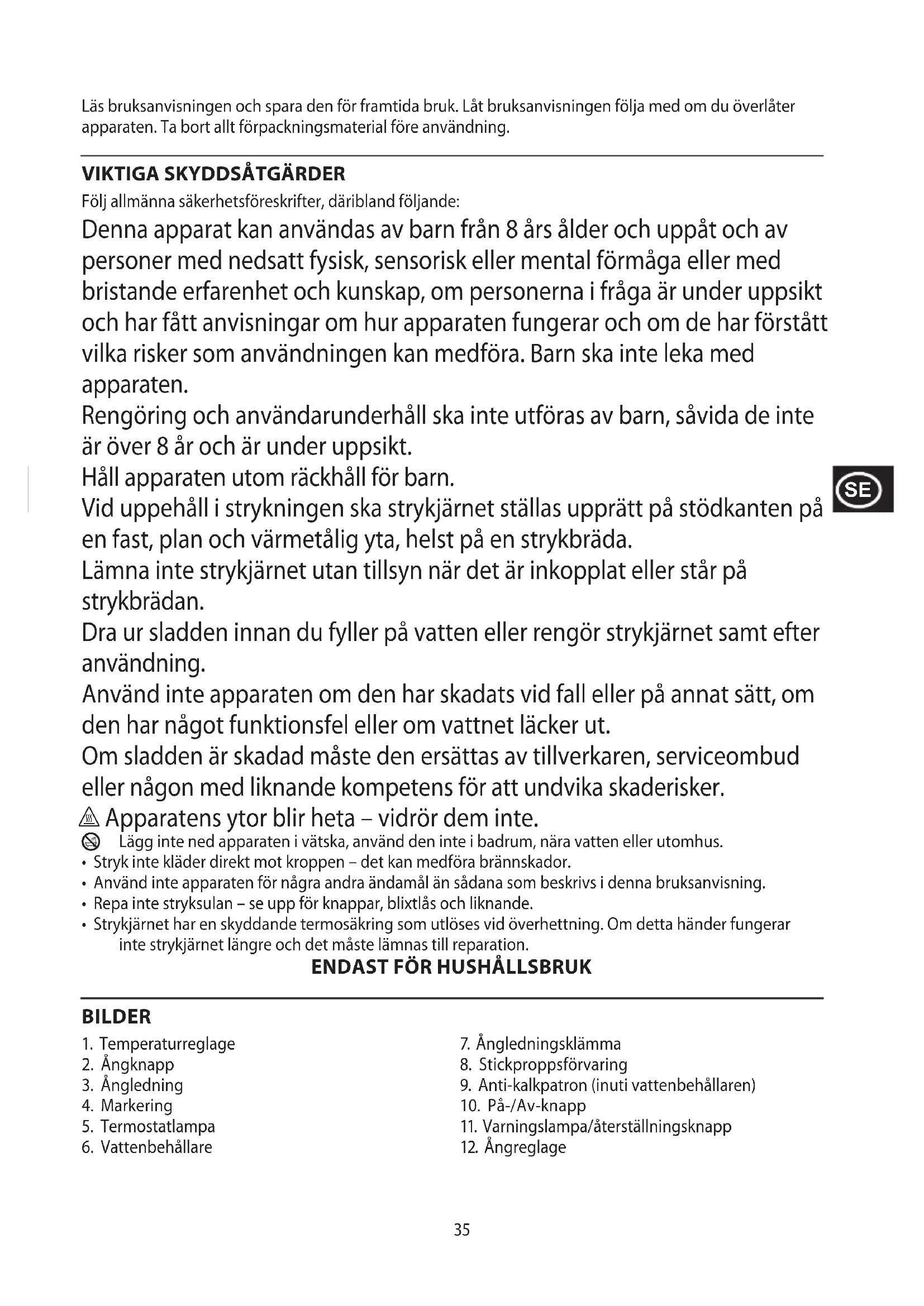 Följ allmänna säkerhetsföreskrifter, däribland följande: Denna apparat kan användas av barn från 8 års ålder och uppåt och av personer med nedsatt fysisk, sensorisk eller mental förmåga eller med bristande erfarenhet och kunskap, om personerna i fråga är under uppsikt och har fått anvisningar om hur apparaten fungerar och om de har förstått vilka risker som användningen kan medföra. Barn ska inte leka med apparaten. Rengöring och användarunderhåll ska inte utföras av barn, såvida de inte är över 8 år och är under uppsikt. Håll apparaten utom räckhåll för barn. Vid uppehåll i strykningen ska strykjärnet ställas upprätt på stödkanten på en fast, plan och värmetålig yta, helst på en strykbräda. Lämna inte strykjärnet utan tillsyn när det är inkopplat eller står på strykbrädan. Dra ur sladden innan du fyller på vatten eller rengör strykjärnet samt efter användning. Använd inte apparaten om den har skadats vid fall eller på annat sätt, om den har något funktionsfel eller om vattnet läcker ut. Om sladden är skadad måste den ersättas av tillverkaren, serviceombud eller någon med liknande kompetens för att undvika skaderisker. h Apparatens ytor blir heta – vidrör dem inte.