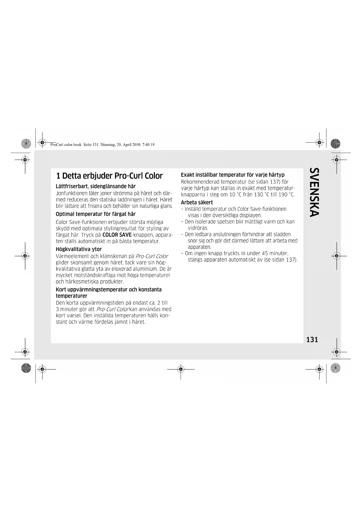 - Barn ska hållas under uppsikt för att säkerställa, att de inte lekar med apparaten. Se till att barn inte bränner sig på den heta apparaten. Förvara apparaten utom räckhåll för barn. ProCurl color.book Seite 133 Dienstag, 20. April 2010 7:40 19SVENSKA