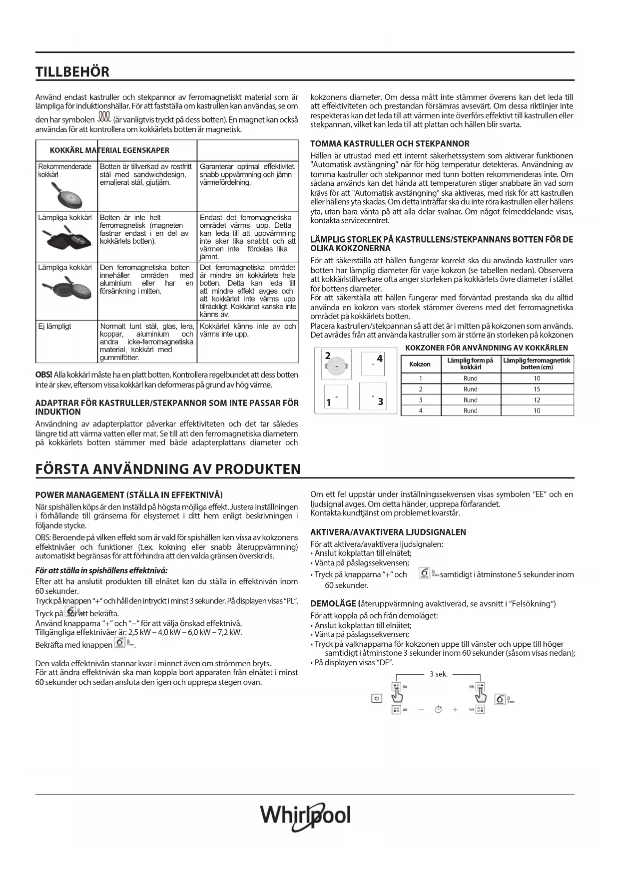 Rekommenderade kokkärl Botten är tillverkad av rostfritt stål med sandwichdesign, emaljerat stål, gjutjärn. Garanterar optimal eektivitet, snabb uppvärmning och jämn värmefördelning. Lämpliga kokkärl Botten är inte helt ferromagnetisk (magneten fastnar endast i en del av kokkärlets botten). Endast det ferromagnetiska området värms upp. Detta kan leda till att uppvärmning inte sker lika snabbt och att värmen inte fördelas lika jämnt. Lämpliga kokkärl Den ferromagnetiska botten innehåller områden med aluminium eller har en försänkning i mitten. Det ferromagnetiska området är mindre än kokkärlets hela botten. Detta kan leda till att mindre eekt avges och att kokkärlet inte värms upp tillräckligt. Kokkärlet kanske inte känns av. Ej lämpligt Normalt tunt stål, glas, lera, koppar, aluminium och andra icke-ferromagnetiska material, kokkärl med gummifötter. Kokkärlet känns inte av och värms inte upp. OBS! Alla kokkärl måste ha en platt botten. Kontrollera regelbundet att dess botten inte är skev, eftersom vissa kokkärl kan deformeras på grund av hög värme. ADAPTRAR FÖR KASTRULLER/STEKPANNOR SOM INTE PASSAR FÖR INDUKTION Användning av adapterplattor påverkar eektiviteten och det tar således längre tid att värma vatten eller mat. Se till att den ferromagnetiska diametern på kokkärlets botten stämmer med både adapterplattans diameter och kokzonens diameter. Om dessa mått inte stämmer överens kan det leda till att eektiviteten och prestandan försämras avsevärt. Om dessa riktlinjer inte respekteras kan det leda till att värmen inte överförs eektivt till kastrullen eller stekpannan, vilket kan leda till att plattan och hällen blir svarta.