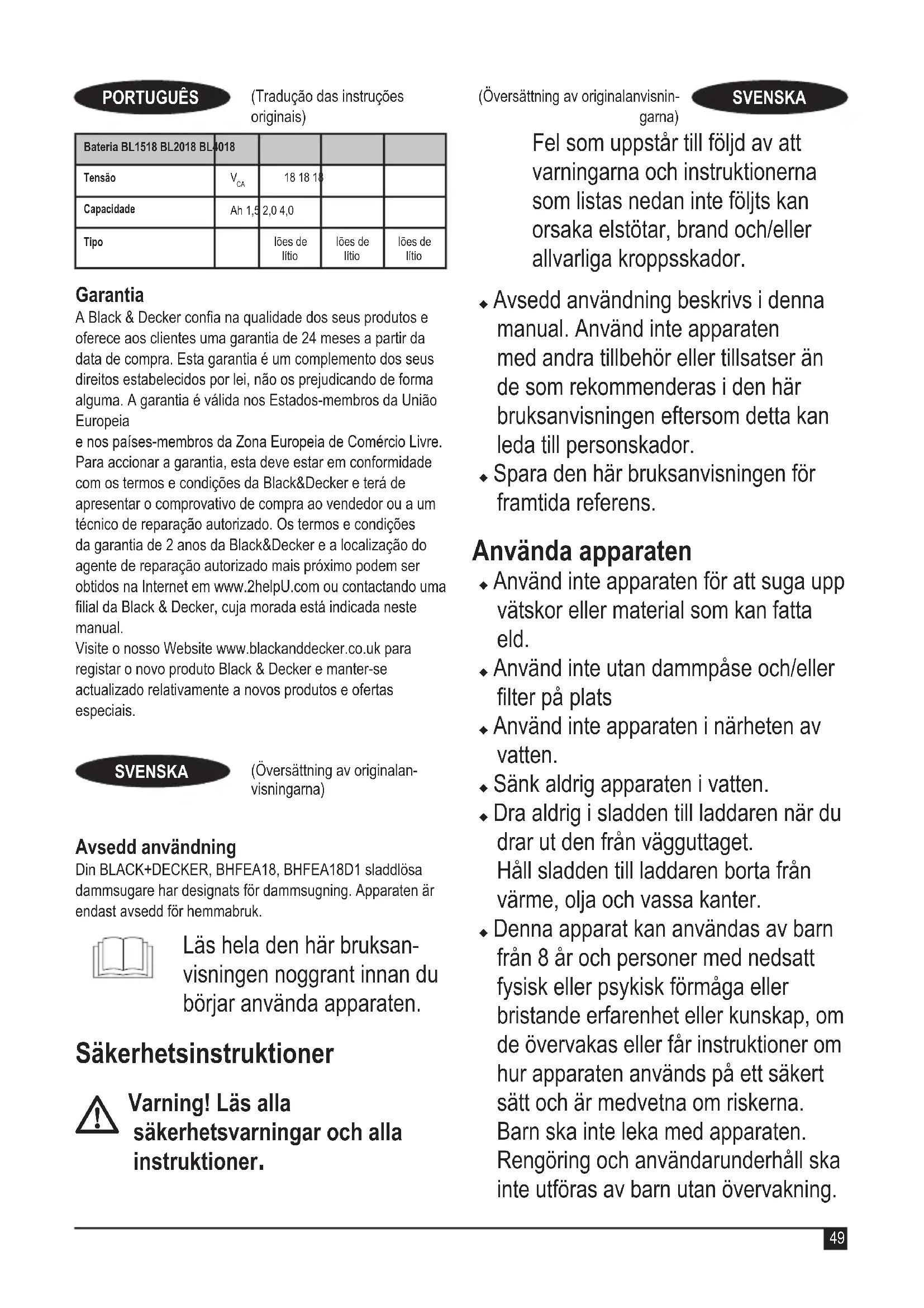 18 18 18KapacitetAh 1,5 2,0 4,0TypLi-jon Li-jon Li-jon Garanti Black & Decker är säker på kvaliteten hos denna produkt och erbjuder kunder 24 månaders garanti från inköpsdatumet. Denna garanti är ett tillägg till dina lagstadgade rättigheter och påverkar inte dessa på något sätt. Garantin är giltig i de territorier som tillhör medlemsstaterna i Europeiska unionen och det europeiska frihandelsområdet. För yrkande under garantin måste yrkandet vara in enlighet med Black&Deckers villkor och du kommer att behöva skicka in bevis på köpet till försäljaren eller en auktoriserad reparatör. Villkoren för Black&Deckers tvååriga garanti och var du hittar din närmaste auktoriserade reparatör kan erhållas på internet på www.2helpU.com, eller genom att kontakta ditt lokal Black & Decker kontor på adressen som angetts i denna bruksanvisning. Besök vår webbplats www.blackanddecker.se för att registrera din nya Black & Decker-produkt samt för att få information om nya produkter och specialerbjudanden.55 (Oversettelse av de opprinnelige instruksjonene)NORSK Tiltenkt bruk Din BLACK+DECKER BHFEA18, BHFEA18D1 trådløse støvsugere er designet for støvsuging. Apparatet er bare beregnet for bruk i hjemmet. Les hele denne håndboken nøye før du bruker appa- ratet. Sikkerhetsinstruksjoner
