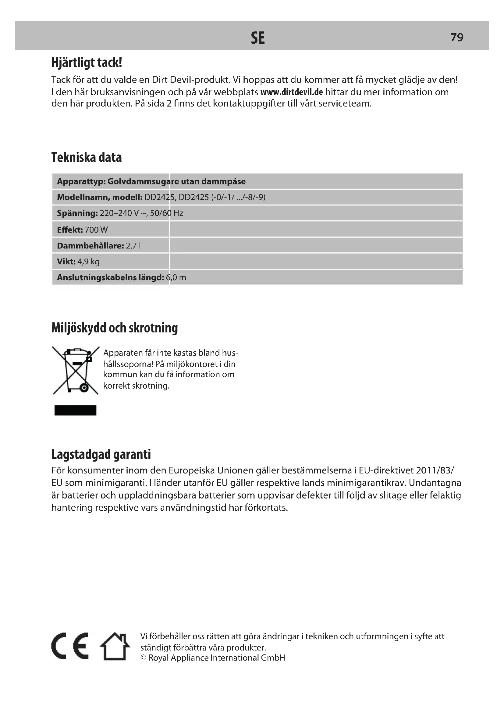 78Miljöskydd och skrotning Apparaten får inte kastas bland hus- hållssoporna! På miljökontoret i din kommun kan du få information om korrekt skrotning. Lagstadgad garanti För konsumenter inom den Europeiska Unionen gäller bestämmelserna i EU-direktivet 2011/83/ EU som minimigaranti. I länder utanför EU gäller respektive lands minimigarantikrav. Undantagna är batterier och uppladdningsbara batterier som uppvisar defekter till följd av slitage eller felaktig hantering respektive vars användningstid har förkortats. Vi förbehåller oss rätten att göra ändringar i tekniken och utformningen i syfte att ständigt förbättra våra produkter. © Royal Appliance International GmbH Hjärtligt tack! Tack för att du valde en Dirt Devil-produkt. Vi hoppas att du kommer att få mycket glädje av den! I den här bruksanvisningen och på vår webbplats www.dirtdevil.de hittar du mer information om den här produkten. På sida 2 nns det kontaktuppgifter till vårt serviceteam. Tekniska data Apparattyp: Golvdammsugare utan dammpåse Modellnamn, modell: DD2425, DD2425 (-0/-1/ .../-8/-9) Spänning: 220–240 V ~, 50/60 Hz Eekt: 700 W Dammbehållare: 2,7 l Vikt: 4,9 kg Anslutningskabelns längd: 6,0 m