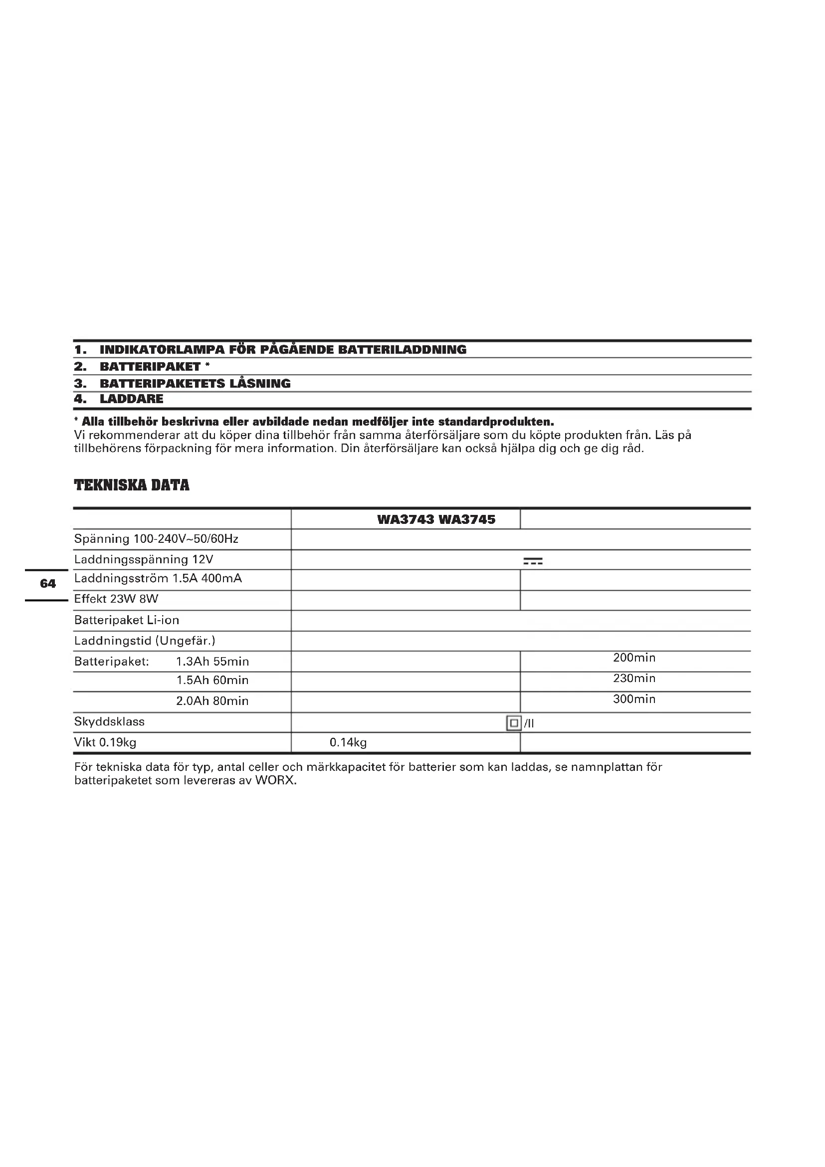 - Alla tillbehör beskrivna eller avbildade nedan medföljer inte standardprodukten. Vi rekommenderar att du köper dina tillbehör från samma återförsäljare som du köpte produkten från. Läs på tillbehörens förpackning för mera information. Din återförsäljare kan också hjälpa dig och ge dig råd. TEKNISKA DATA WA3743 WA3745 Spänning 100-240V~50/60Hz Laddningsspänning 12V Laddningsström 1.5A 400mA Effekt 23W 8W Batteripaket Li-ion Laddningstid (Ungefär.) Batteripaket: 1.3Ah 55min 200min 1.5Ah 60min 230min 2.0Ah 80min 300min Skyddsklass /II Vikt 0.19kg 0.14kg För tekniska data för typ, antal celler och märkkapacitet för batterier som kan laddas, se namnplattan för batteripaketet som levereras av WORX.65 SÄKERHETSINSTRUKTIONER SÄKERHETSINSTRUKTIONER VARNING: Läs igenom alla säkerhetsvarningar och -instruktioner. Läs alla instruktioner. Följs inte alla nedanstående instruktioner kan det leda till elektriska stötar, brand och/eller allvarliga skador. Spara alla varningar och instruktioner för framtida referens. Apparaten kan användas av barn från 8 års ålder och uppåt, och personer med nedsatt fysisk, sensorisk eller mental förmåga eller som saknar erfarenhet och kunskap, om de har fått handledning eller instruktioner beträffande användning av apparaten på ett säkert sätt och förstår vilka faror det innebär. Barn skall inte leka med apparaten. Rengöring och användarunderhåll får inte utföras av barn utan tillsyn. Om strömsladden är trasig, måste den bytas av tillverkaren eller dess serviceagent eller liknande behörig person för att undvika fara.