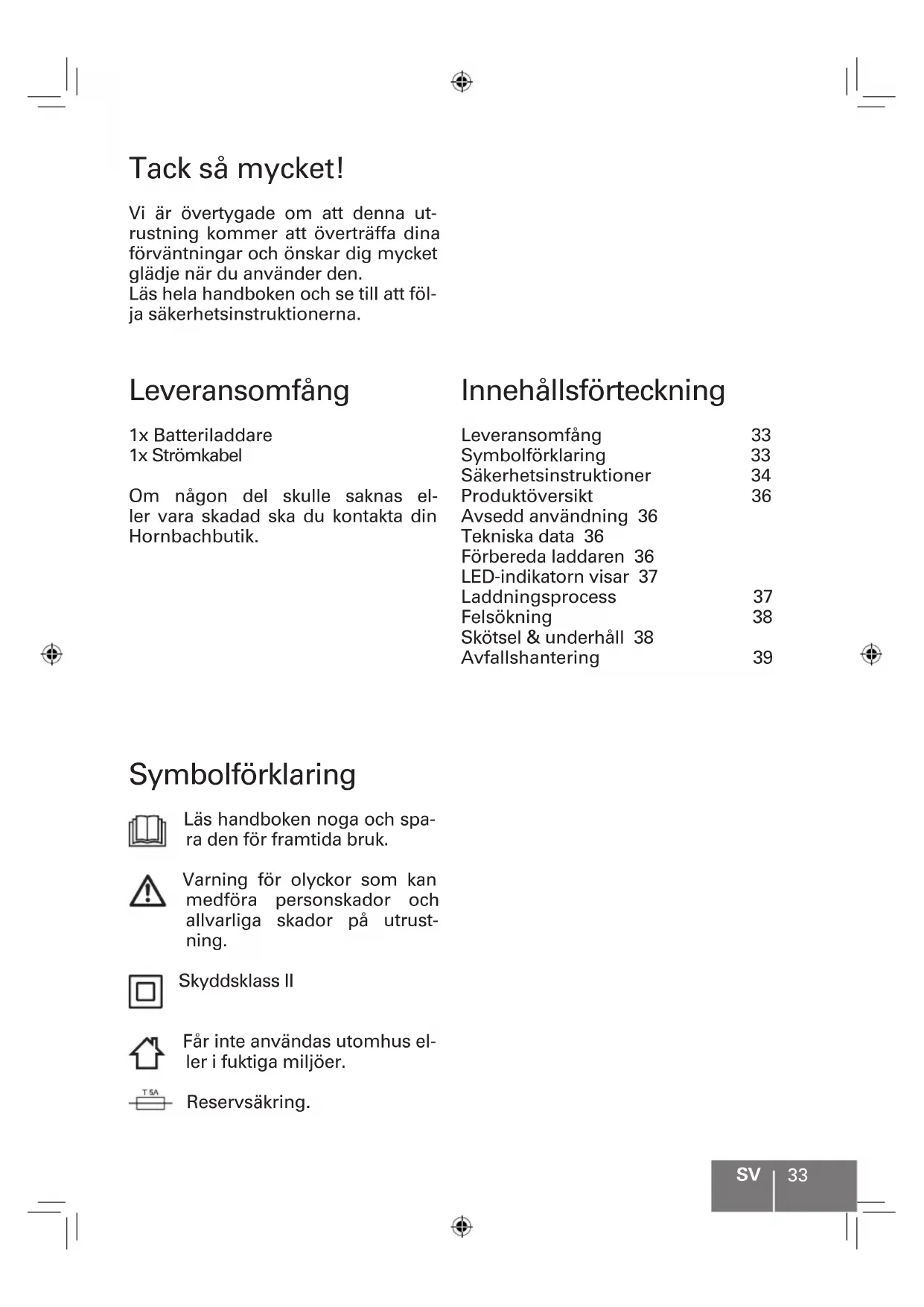 Tack så mycket! Vi är övertygade om att denna ut- rustning kommer att överträa dina förväntningar och önskar dig mycket glädje när du använder den. Läs hela handboken och se till att föl- ja säkerhetsinstruktionerna. Leveransomfång 1x Batteriladdare 1x Strömkabel Om någon del skulle saknas el- ler vara skadad ska du kontakta din Hornbachbutik. Symbolförklaring Läs handboken noga och spa- ra den för framtida bruk. Varning för olyckor som kan medföra personskador och allvarliga skador på utrust- ning. Skyddsklass II Får inte användas utomhus el- ler i fuktiga miljöer. Reservsäkring. Innehållsförteckning Leveransomfång 33 Symbolförklaring 33 Säkerhetsinstruktioner 34 Produktöversikt 36 Avsedd användning 36 Tekniska data 36 Förbereda laddaren 36 LED-indikatorn visar 37 Laddningsprocess 37 Felsökning 38 Skötsel & underhåll 38 Avfallshantering 39SV