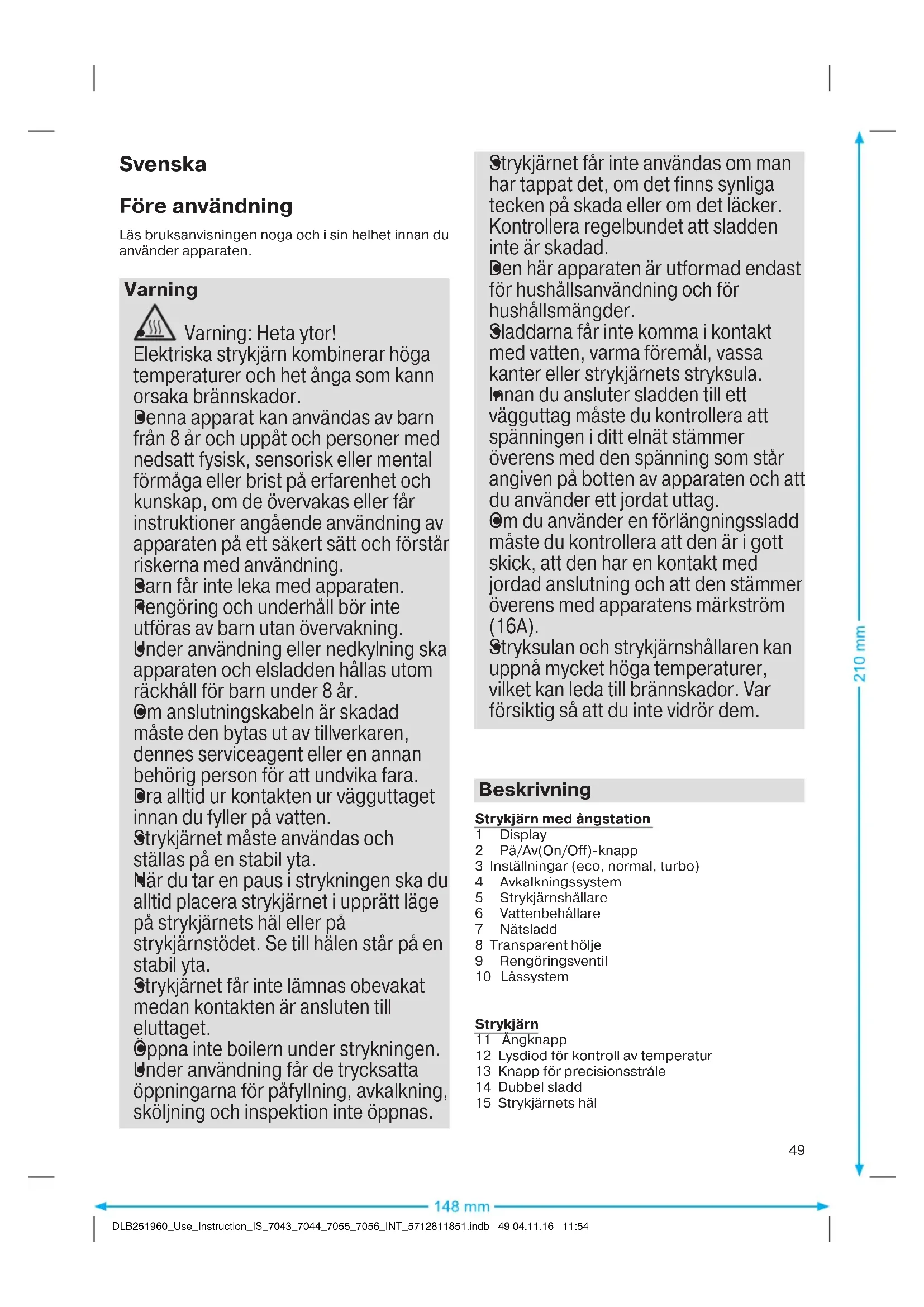 DLB251960_Use_Instruction_IS_7043_7044_7055_7056_INT_5712811851.indb 48 04.11.16 11:54Svenska Före användning Läs bruksanvisningen noga och i sin helhet innan du använder apparaten. Varning