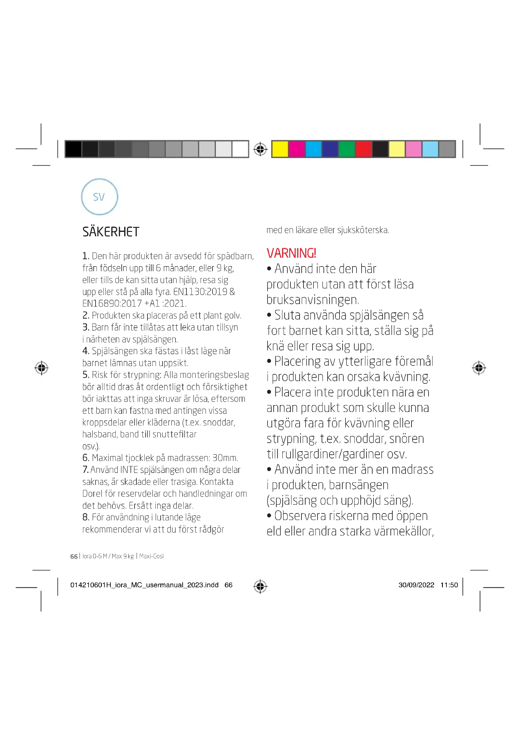 - Använd endast madrassen som säljs med den här barnsängen. Lägg inte ytterligare en madrass ovanpå denna. Risk för kvävning.