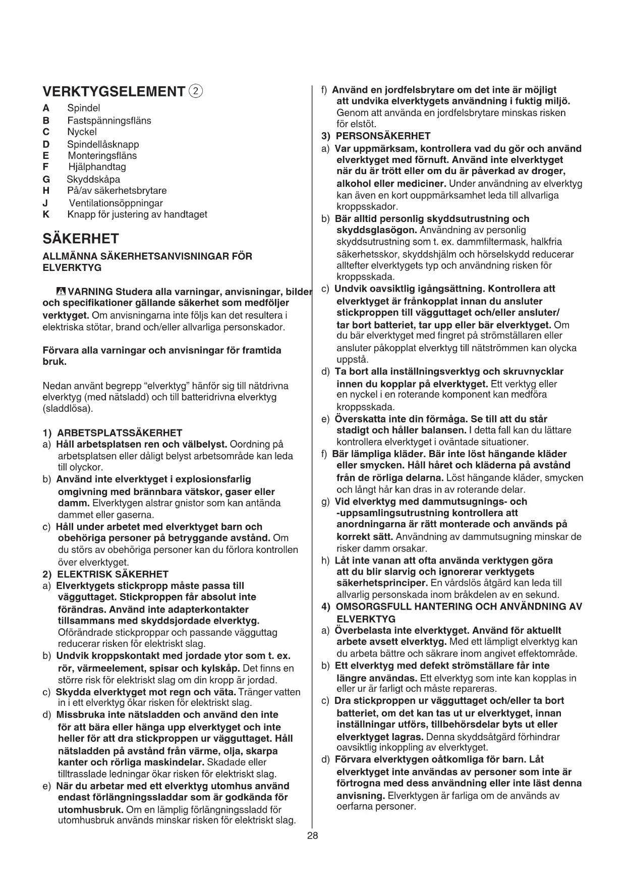A Spindel B Fastspänningsäns C Nyckel D Spindellåsknapp E Monteringsäns F Hjälphandtag G Skyddskåpa H På/av säkerhetsbrytare J Ventilationsöppningar K Knapp för justering av handtaget SÄKERHET