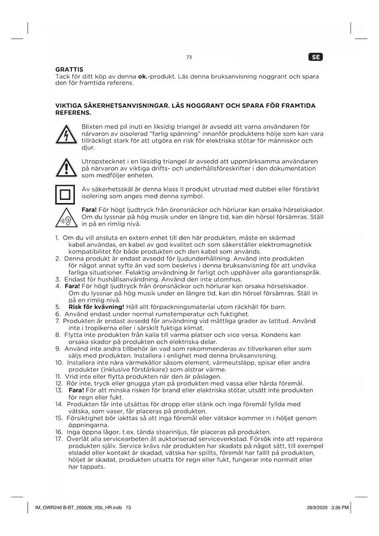 produkten själv. Service krävs när produkten har skadats på något sätt, till exempel elsladd eller kontakt är skadad, vätska har spillts, föremål har fallit på produkten, höljet är skadat, produkten utsatts för regn eller fukt, fungerar inte normalt eller har tappats. IM_OWR240 B-BT_200928_V05_HR.indb 73IM_OWR240 B-BT_200928_V05_HR.indb 73 28/9/2020 3:36 PM28/9/2020 3:36 PMSE