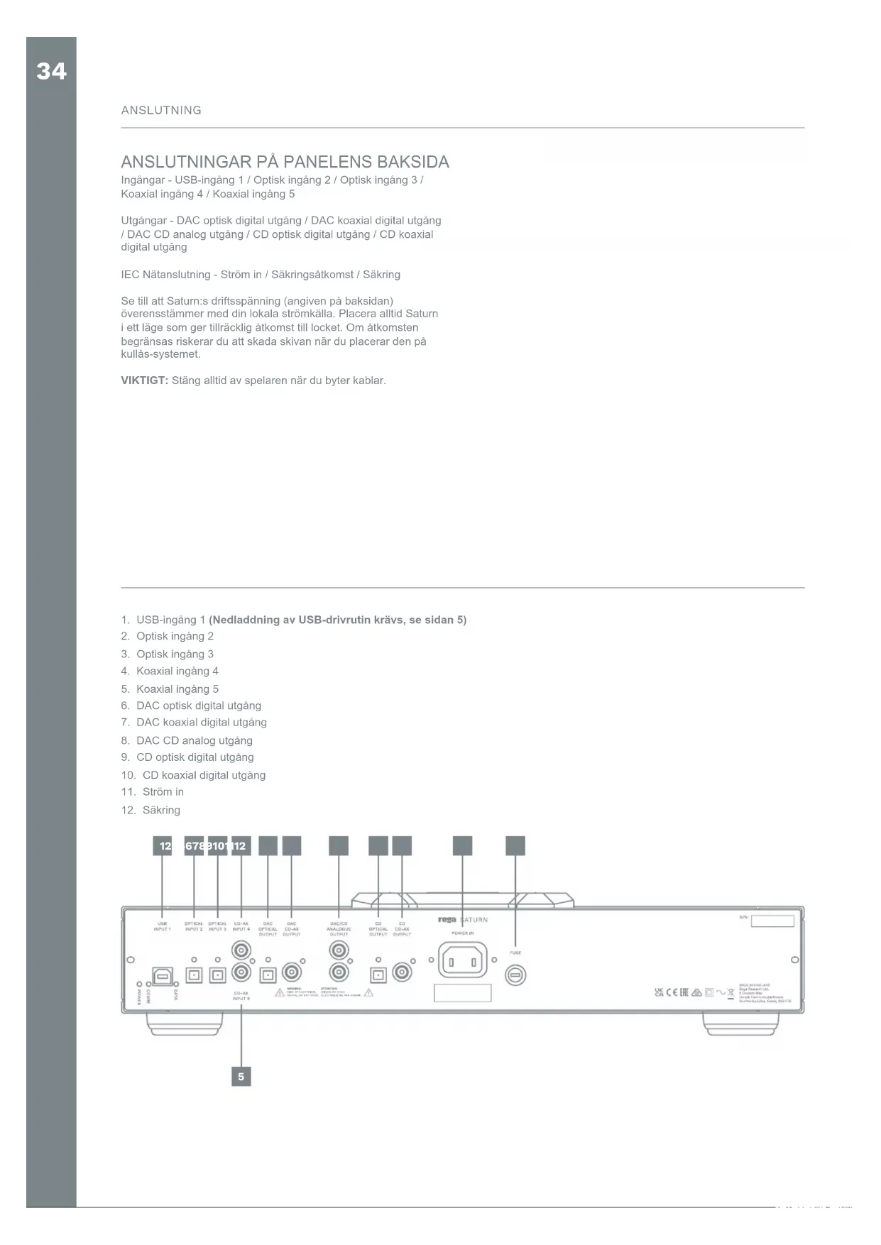 Ingångar - USB-ingång 1 / Optisk ingång 2 / Optisk ingång 3 / Koaxial ingång 4 / Koaxial ingång 5 Utgångar - DAC optisk digital utgång / DAC koaxial digital utgång / DAC CD analog utgång / CD optisk digital utgång / CD koaxial digital utgång IEC Nätanslutning - Ström in / Säkringsåtkomst / Säkring Se till att Saturn:s driftsspänning (angiven på baksidan) överensstämmer med din lokala strömkälla. Placera alltid Saturn i ett läge som ger tillräcklig åtkomst till locket. Om åtkomsten begränsas riskerar du att skada skivan när du placerar den på kullås-systemet. VIKTIGT: Stäng alltid av spelaren när du byter kablar.