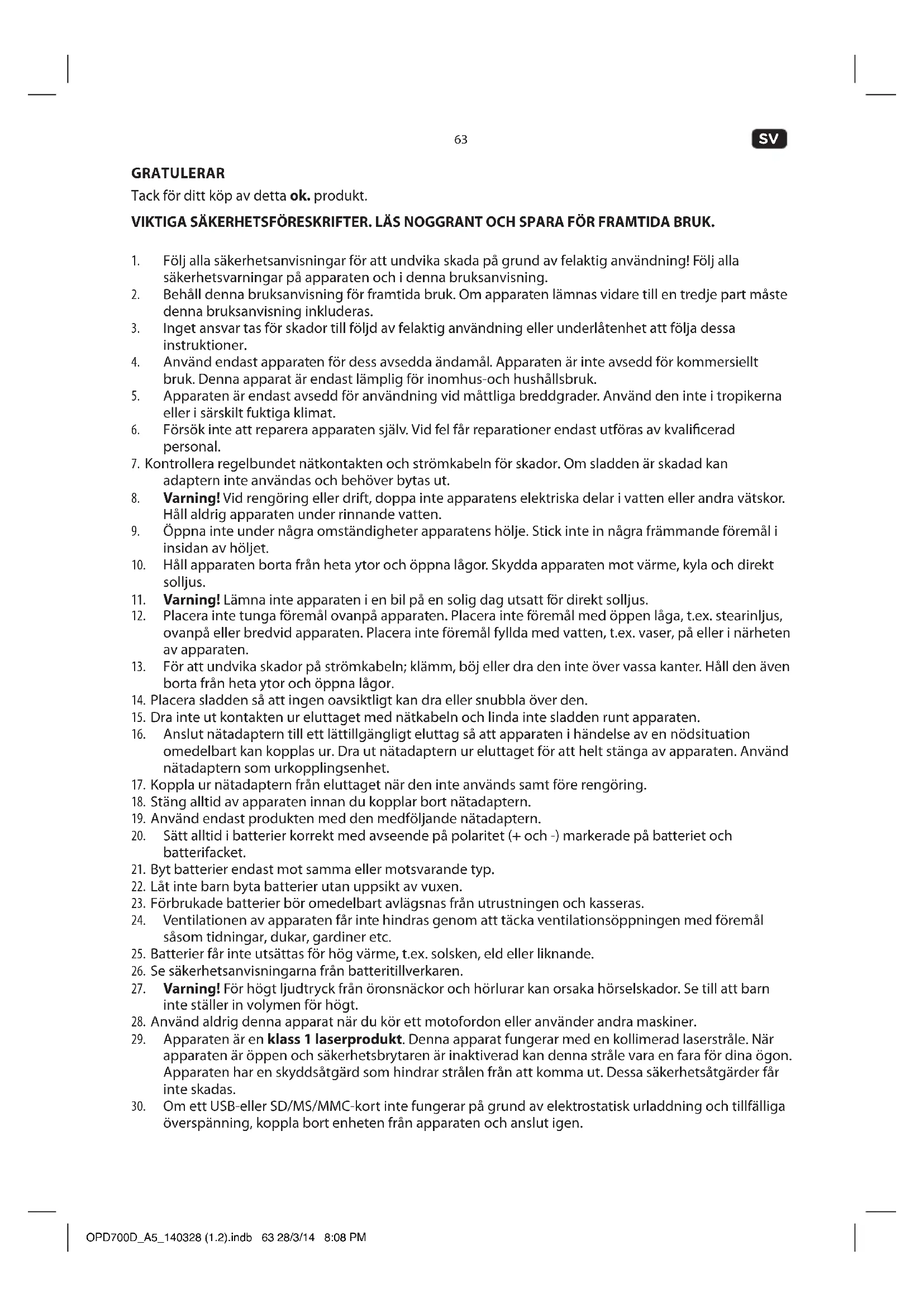 överspänning, koppla bort enheten från apparaten och anslut igen. OPD700D_A5_140328 (1.2).indb 63 28/3/14 8:08 PM64