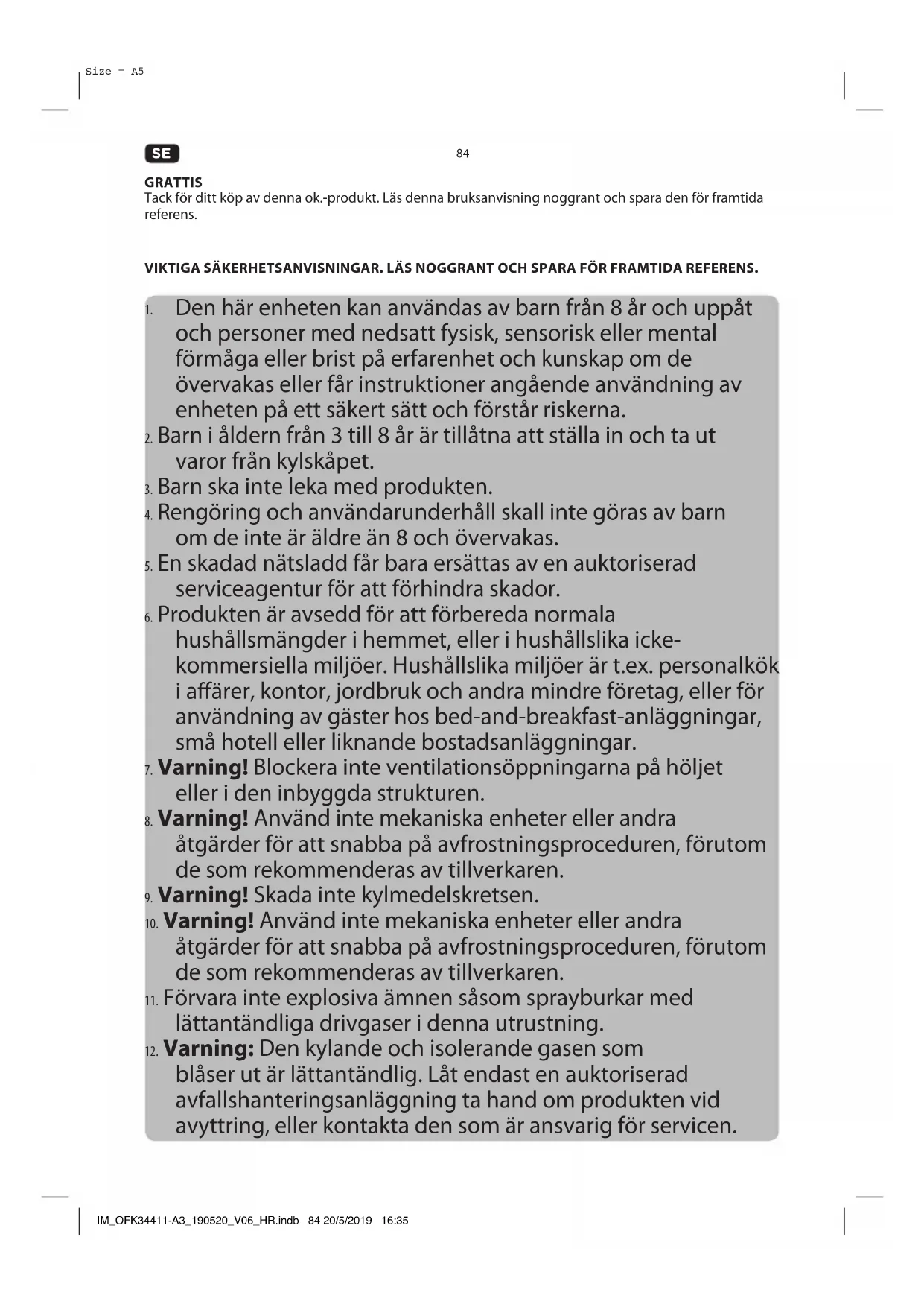 - Låt dörren vara öppen för att undvika bildandet av obehagliga lukt och mögel. IM_OFK34411-A3_190520_V06_HR.indb 89 20/5/2019 16:3590 Size = A5