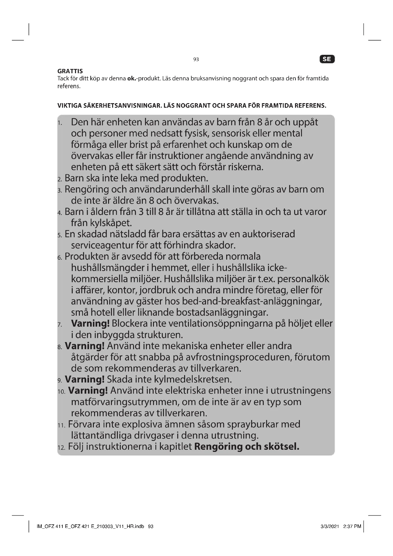 - Låt dörren vara öppen för att undvika bildandet av obehagliga lukt och mögel. IM_OFZ 411 E_OFZ 421 E_210303_V11_HR.indb 99IM_OFZ 411 E_OFZ 421 E_210303_V11_HR.indb 99 3/3/2021 2:37 PM3/3/2021 2:37 PM100