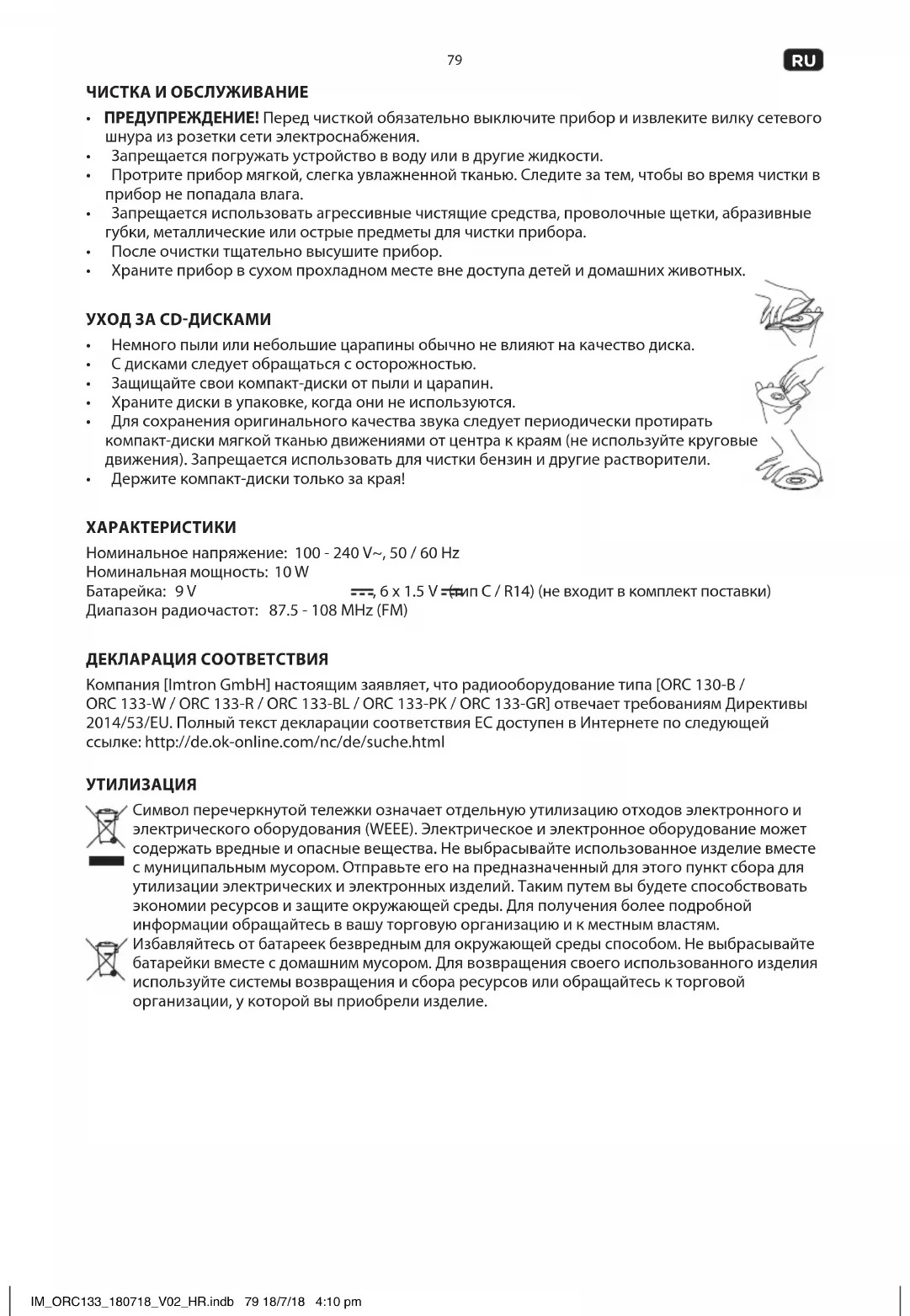 Härmed försäkrar [Imtron GmbH] att denna typ av radioutrustning [ORC 130-B / ORC 133-W / ORC 133-R / ORC 133-BL / ORC 133-PK / ORC 133-GR] överensstämmer med direktiv 2014/53/EU. Den fullständiga texten till EU-försäkran om överensstämmelse nns på följande webbadress: http://de.ok-online.com/nc/de/suche.html KASSERING Logotypen med den överkorsade soptunnan kräver separat insamling av avfall som innehåller elektriska eller elektroniska produkter (WEEE). Elektrisk och elektronisk utrustning kan innehålla farliga och skadliga ämnen. Släng inte denna apparat som osorterat avfall. Lämna in den till en uppsamlingsplats för återvinning av WEEE. På så sätt hjälper du till att bevara resurser och skydda miljön. Kontakta din återförsäljare eller lokala myndigheter för mer information. Gör dig av med batterierna på ett miljövänligt sätt. Släng inte batterier i hushållssoporna. Använd återvinnings och uppsamlingssystemet i din kommun eller kontakta den återförsäljare där du köpte produkten. IM_ORC133_180718_V02_HR.indb 86 18/7/18 4:10 pm87