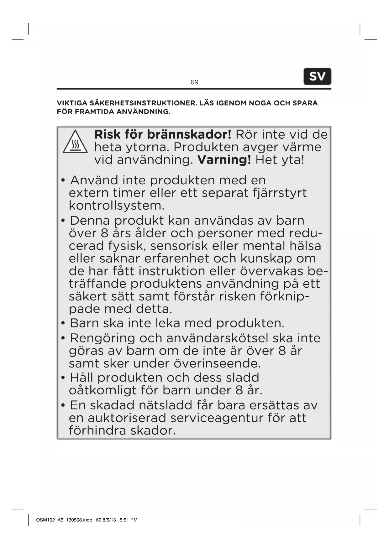 - Förvara produkten på en torr och sval plats som är skyddad mot fukt och direkt solljus. Förvara denna produkt utom räckhåll för barn. SPECIFIKATION Märkspänning: 220–240 V~, 50/60 Hz /Anslutningseekt: 750 W / Skyddsklass I AVYTTRING Denna apparat får inte kastas med hushållsavfallet. Lämna in den på återvinningsstationen för återvinning av elektroniskt och elektriskt avfall. Genom att göra detta hjälper du till att bevara resurserna och skydda miljön. Kontakta din återförsäljare eller lokala myndigheter för mer information. OSM102_A5_130508.indb 74 8/5/13 5:52 PM75 Size - A5 ÖNEMLİ GÜVENLİK TALİMATLARI. DİKKATLİCE OKUYUN VE REFERANS OLARAK SAKLAYIN. Yanma tehlikesi! Ürünün sıcak yü- zeylerine dokunmayın. İşletim sırasın- da ürünün üzerinde yukarı çıkan ısı söz konusudur. Dikkat! Sıcak yüzeyler!