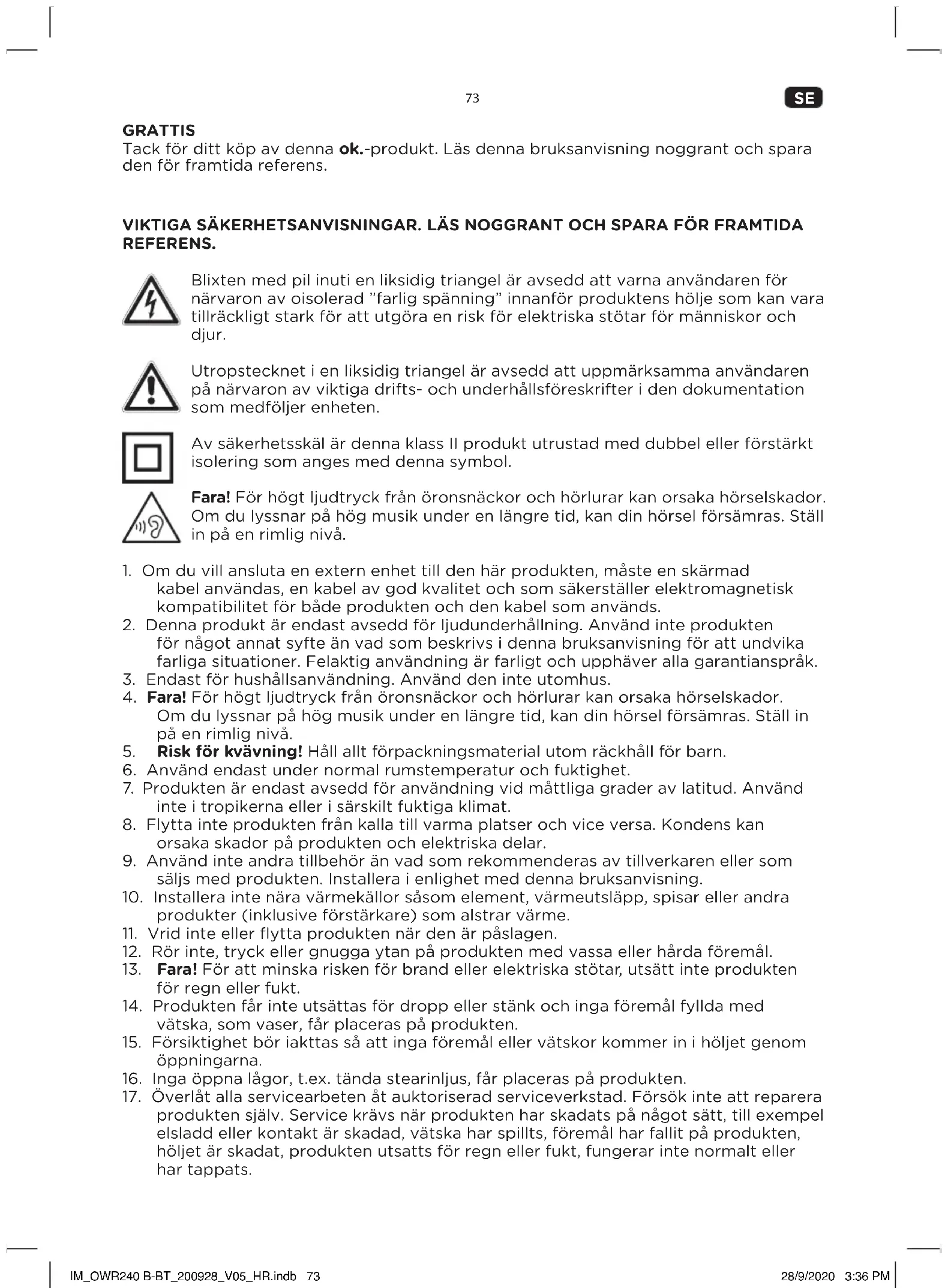 produkten själv. Service krävs när produkten har skadats på något sätt, till exempel elsladd eller kontakt är skadad, vätska har spillts, föremål har fallit på produkten, höljet är skadat, produkten utsatts för regn eller fukt, fungerar inte normalt eller har tappats. IM_OWR240 B-BT_200928_V05_HR.indb 73IM_OWR240 B-BT_200928_V05_HR.indb 73 28/9/2020 3:36 PM28/9/2020 3:36 PMSE