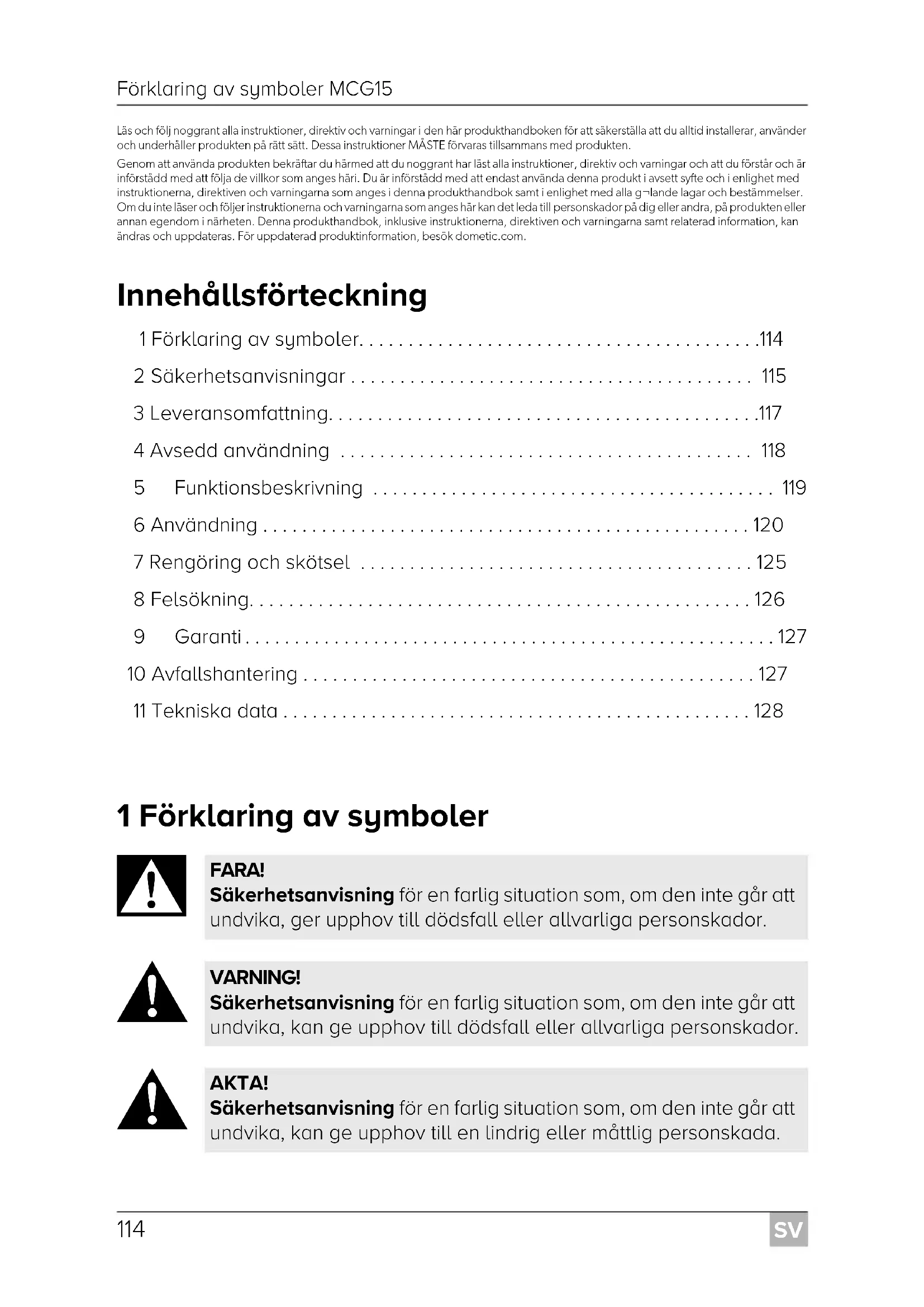 - Läs och följ noggrant alla instruktioner, direktiv och varningar i den här produkthandboken för att säkerställa att du alltid installerar, använder och underhåller produkten på rätt sätt. Dessa instruktioner MÅSTE förvaras tillsammans med produkten. Genom att använda produkten bekräftar du härmed att du noggrant har läst alla instruktioner, direktiv och varningar och att du förstår och är införstådd med att följa de villkor som anges häri. Du är införstådd med att endast använda denna produkt i avsett syfte och i enlighet med instruktionerna, direktiven och varningarna som anges i denna produkthandbok samt i enlighet med alla g¬lande lagar och bestämmelser. Om du inte läser och följer instruktionerna och varningarna som anges här kan det leda till personskador på dig eller andra, på produkten eller annan egendom i närheten. Denna produkthandbok, inklusive instruktionerna, direktiven och varningarna samt relaterad information, kan ändras och uppdateras. För uppdaterad produktinformation, besök dometic.com. Innehållsförteckning 1 Förklaring av symboler p. 114
